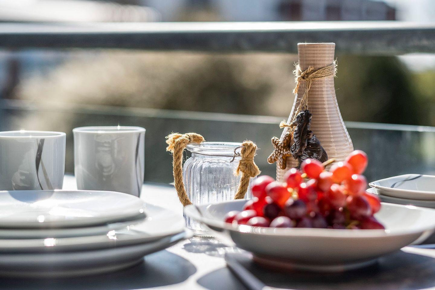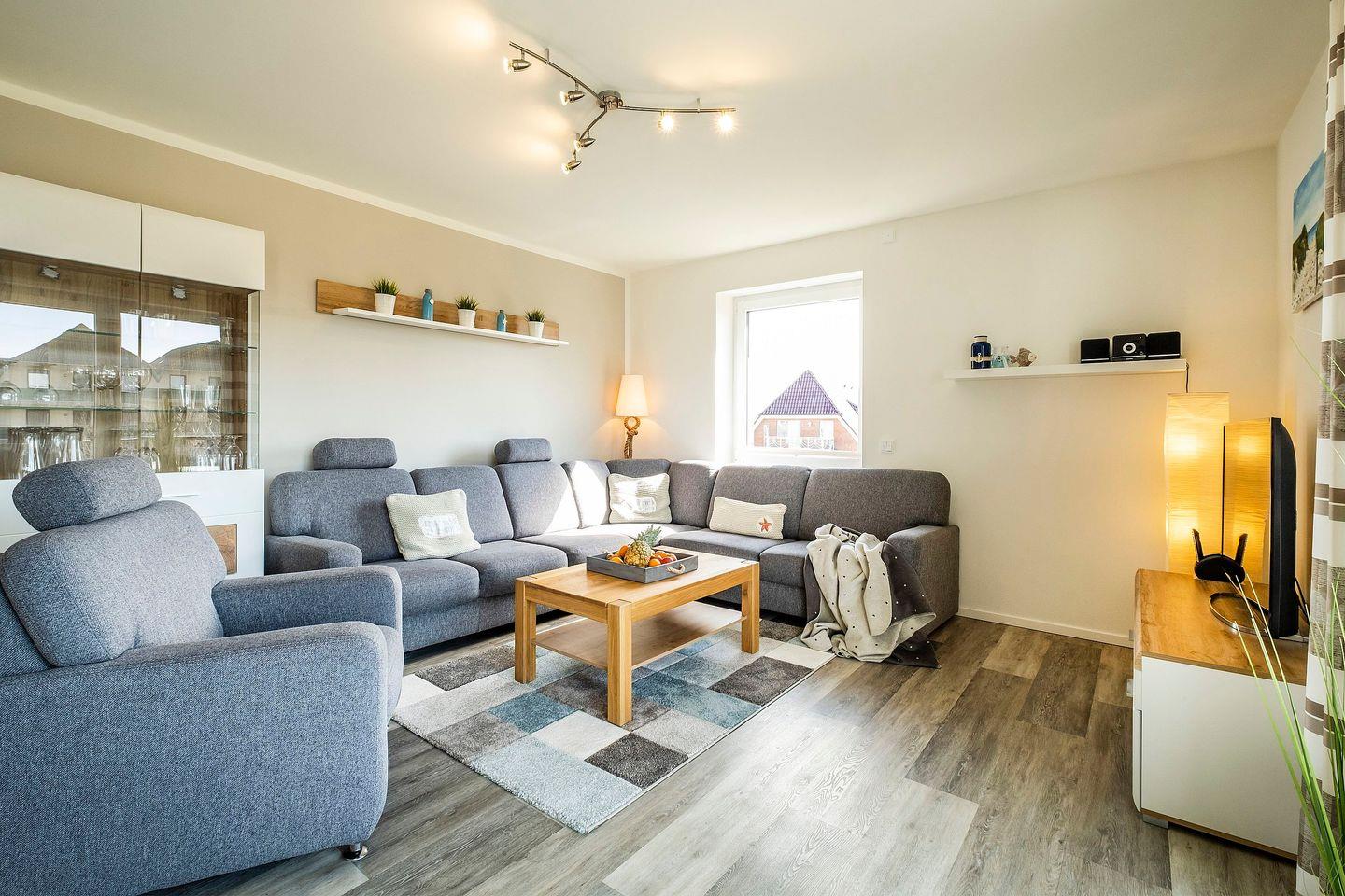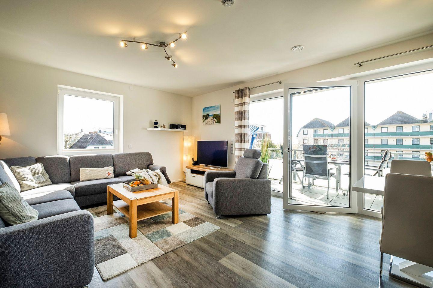 Vom Balkon aus, der mit einem Strandkorb ausgestattet ist, haben Sie Sicht auf den Deich und teils auf die Nordsee. Der Sandstrand, der Hafen und die Flaniermeile sind gut fußläufig zu erreichen, da sie sich in der Nähe befinden.