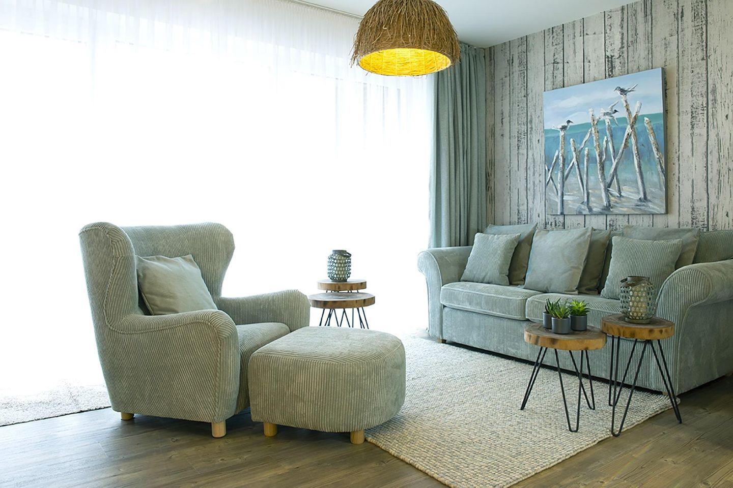 Dieser lässt sich auch vom lichtdurchfluteten Wohnzimmer aus betrachten, dem Herz des Möövnests. Hier laden der kuschelige XL-Lounge-Sessel und das komfortable 3er-Sofa ein, sich herrlich einzunisten und auf dem beeindruckend großen Flachbildschirm entspannt einen Serienmarathon einzulegen.