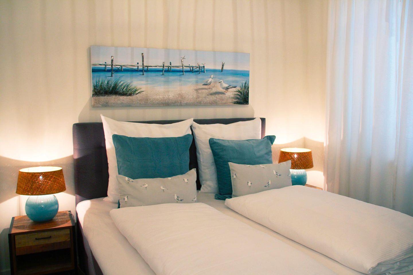 Den krönenden Abschluss für jeden Tag bereitet das Schlafzimmer. Das breite Boxspringbett verführt zum Reintauchen und zu gemütlichen Kuschelstunden, der Flachbildfernseher zu einem relaxten Morgen mit Kaffee im Bett. Ein kleiner Sekretär fügt sich dezent ins Schlafzimmer ein und erleichtert das mobile Arbeiten vom Laptop aus.