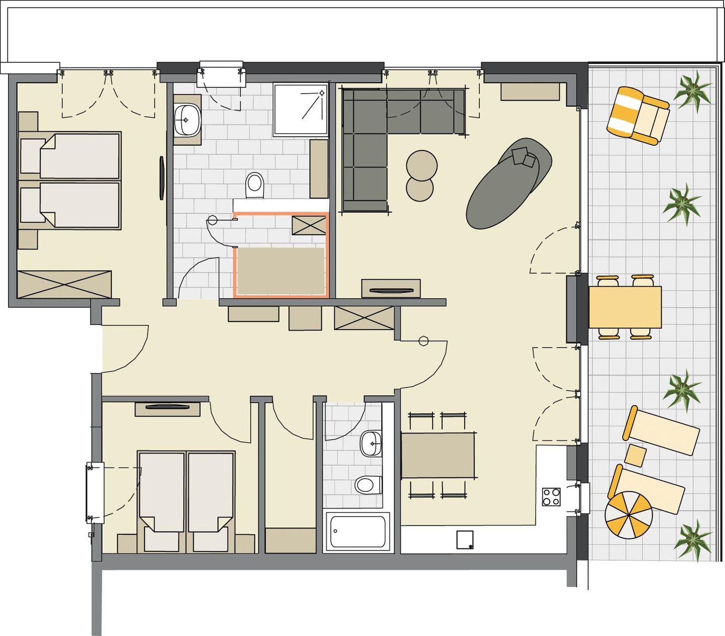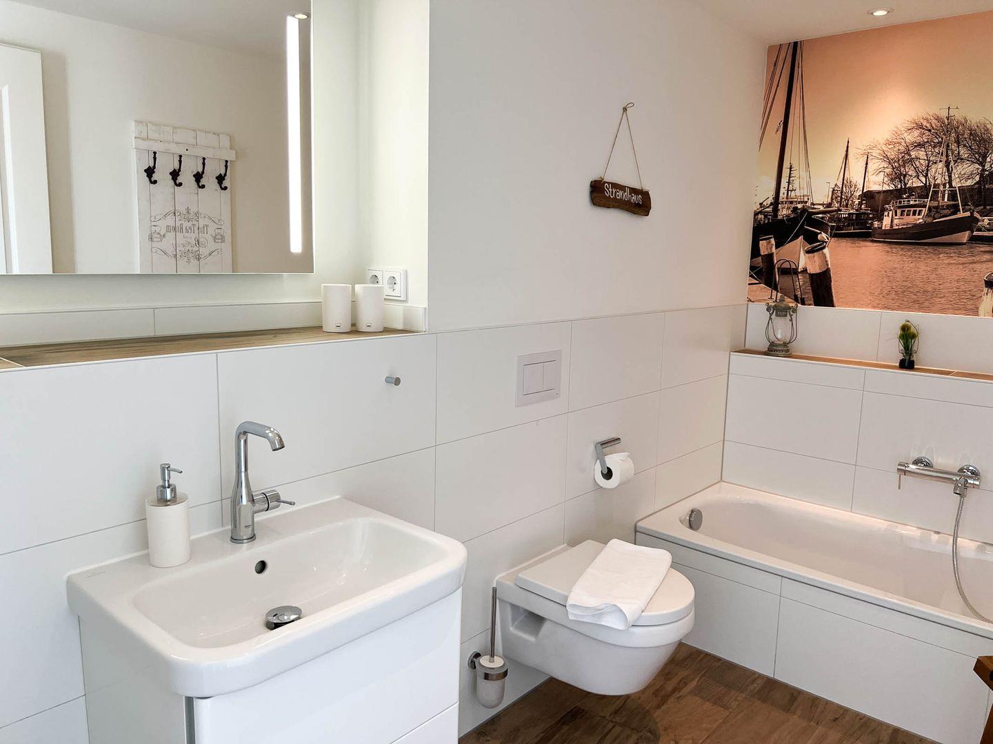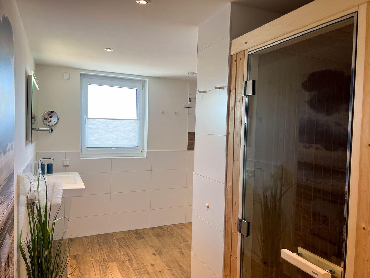 Sanitär: 1 Duschbad mit integrierter Sauna, 1 Badewannen-Bad, Handtuchheizung, Haar-Föhn, Kosmetikspiegel