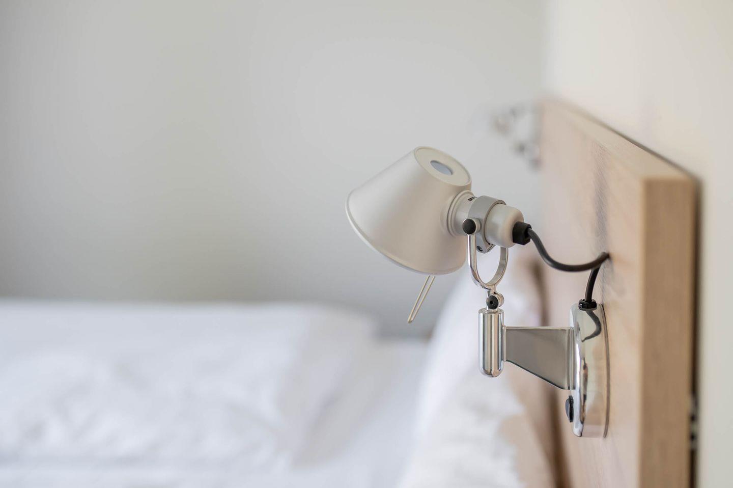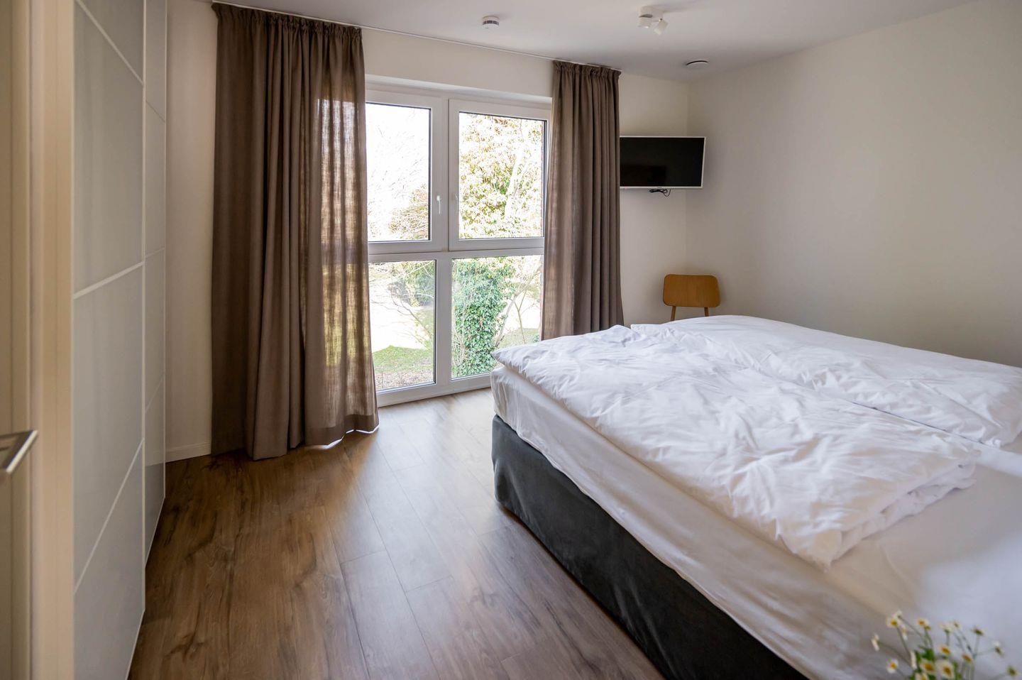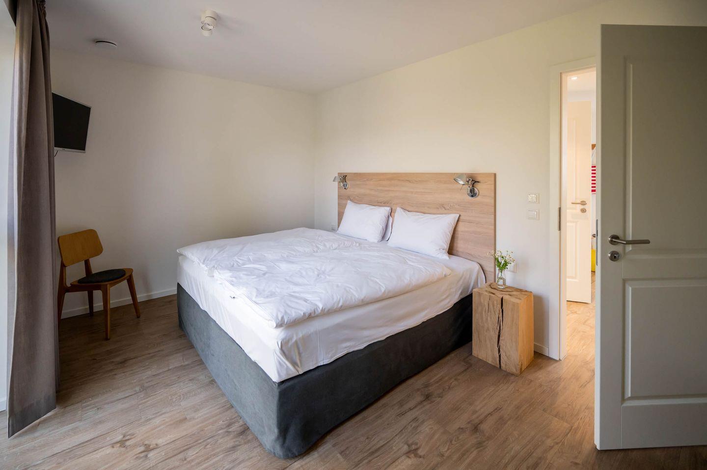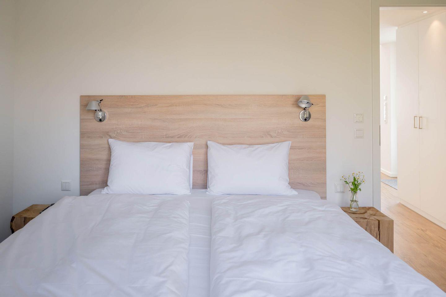 Wir sind der Überzeugung, dass ein guter Schlaf der wichtigste Faktor für einen erholsamen Urlaub und einen ausgeglichenen Start in den Tag darstellt. Deswegen haben wir viel Wert auf die Auswahl der Betten gelegt und uns für Coco-Mat-Betten aus Griechenland entschieden. Die hinterleuchtete Bettrückwand sorgt für eine gemütliche Atmosphäre und lädt dazu ein, den Tag an der Küste in Ruhe ausklingen zu lassen. Genießen Sie nach dem Aufwachen am Morgen den Blick ins Grüne oder starten Sie mit einem Kaffee/Tee und einer Folge ihrer Lieblingsserie auf dem schlafzimmereigenen Fernseher. Ein doppelter Kleiderschrank im Schlafzimmer hält genügend Platz bereit, um alles Wichtige zu verstauen und aufzuhängen.