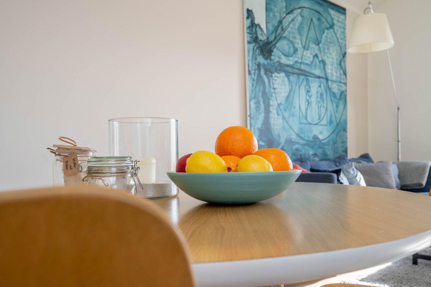 Die zum Wohnraum hin offene Küche lässt wenig Wünsche offen. Von der Zubereitung des Frühstücks samt Kaffee und Tee bis hin zum opulenten Mittag- oder Abendessen, jeder Genießer und Hobbykoch kommt hier ganz und gar auf seine Kosten. Der Esstisch ermöglicht ein gemütliches Zusammensitzen, auch nach dem Essen.