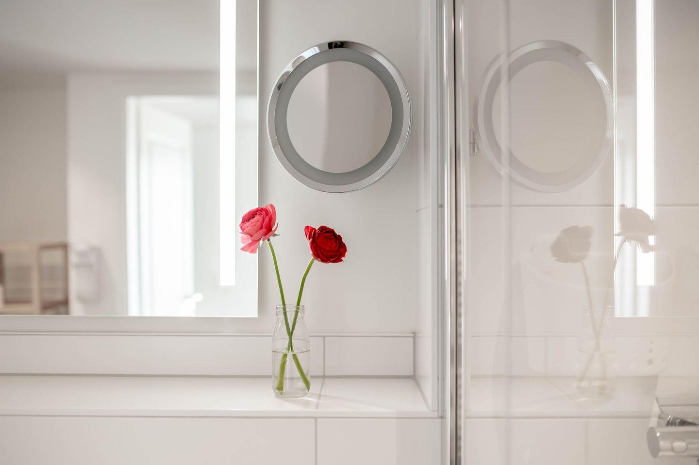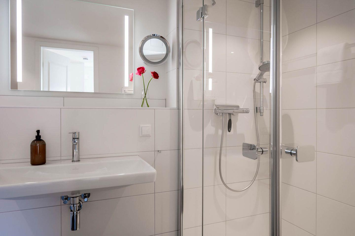 Badezimmer: Dusche, Handtuchheizung, Fön, Kosmetikspiegel