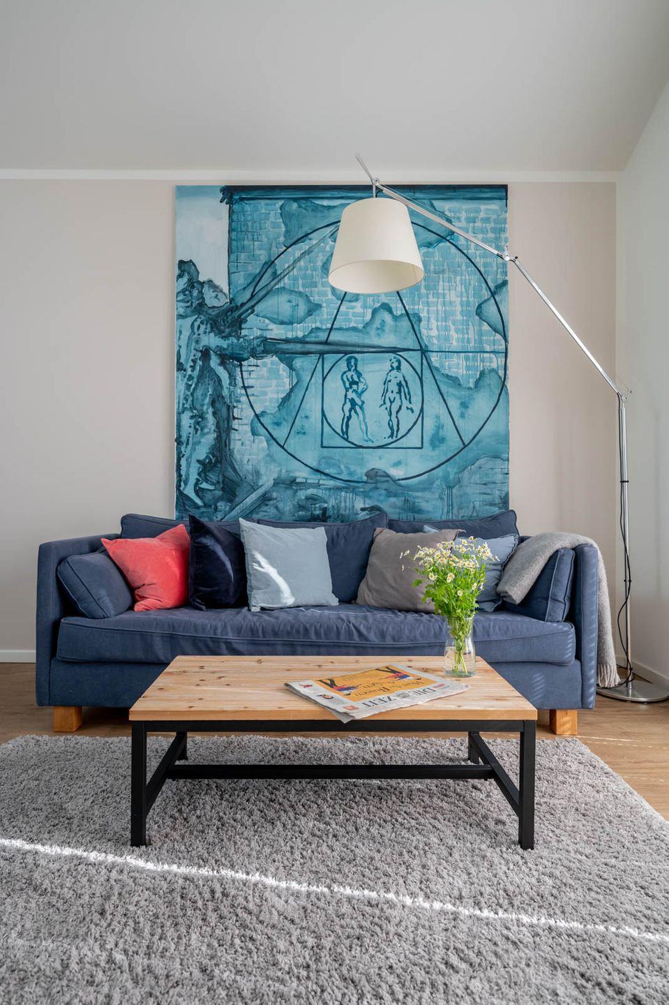 Das Wohnzimmer ist der ideale Ort für einen Spielenachmittag, zum Schmökern in der Urlaubslektüre oder für den Filmabend mit der Familie. Das gemütliche Sofa und ein separater Sessel bieten Platz für alle Mitreisenden und ein Dachfenster sorgt für mehr Licht am Tag und den Blick auf die Sterne bei Nacht. Niklas Wendt, ein befreundeter Künstler, hat uns für jedes der vier Apartments eins seiner Kunstwerke als Leihgabe überlassen. Kommen Sie für weitere Informationen gerne auf uns zu.