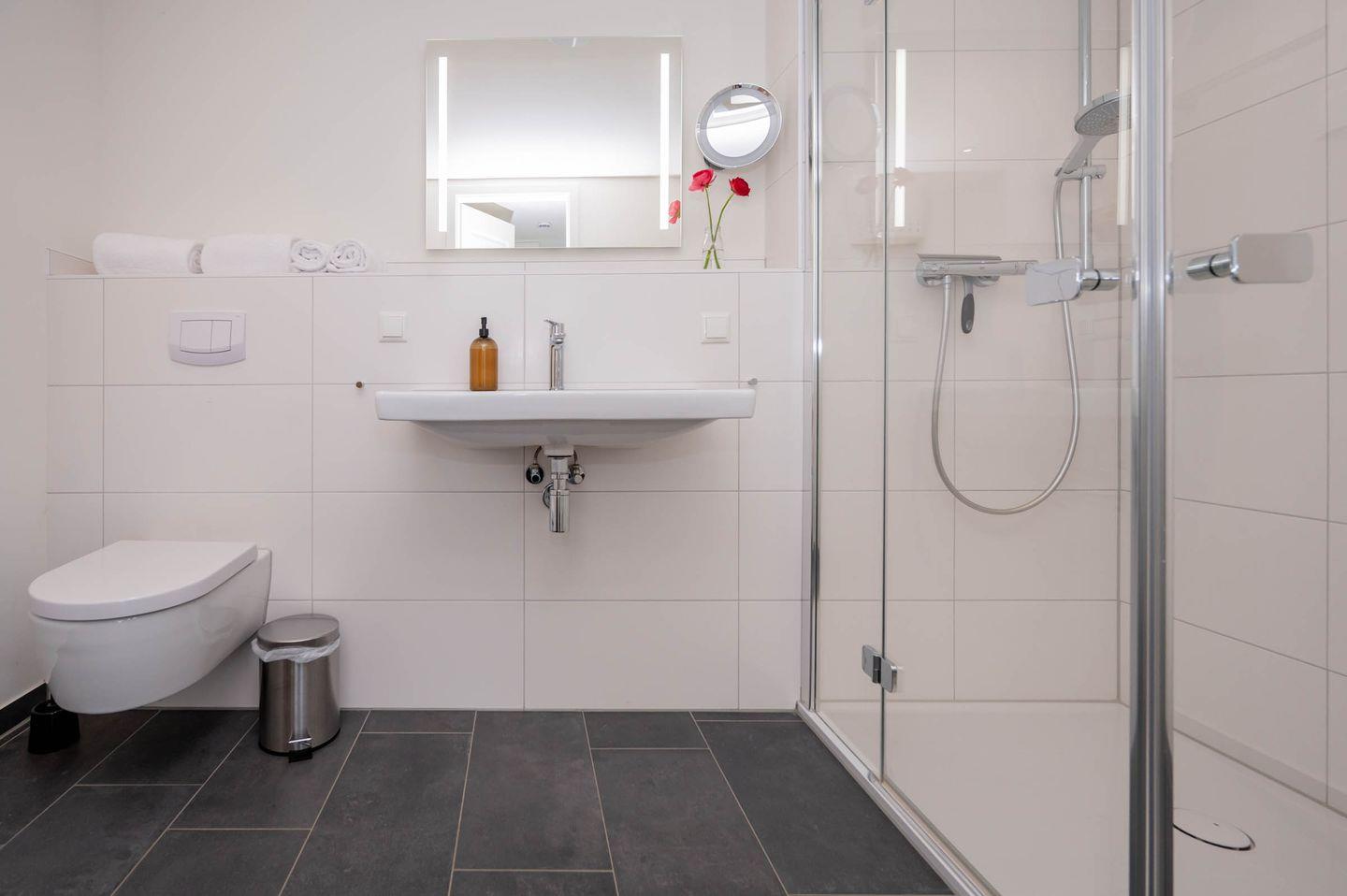 Das Appartement Mariekje verfügt über ein großzügiges Badezimmer mit Dusche (Duschkopf verfügt über vier Funktionen), Waschbecken, Handtuchtrockner, Fußbodenheizung, Kosmetikspiegel und WC.