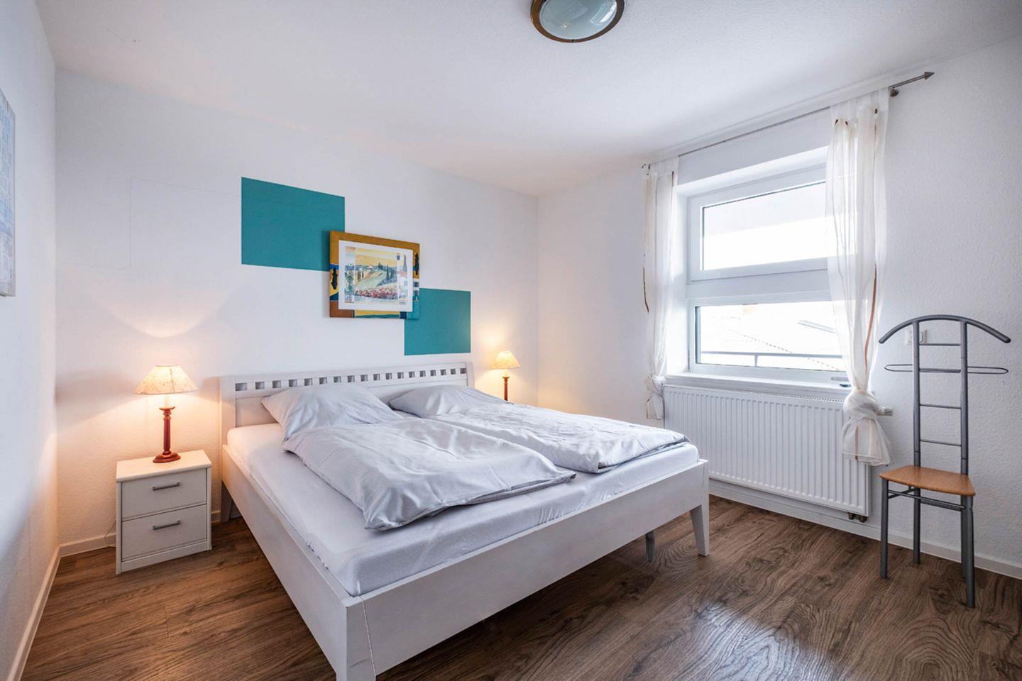 Das Schlafzimmer ist mit einem Doppelbett ausgestattet und verfügt über einen Wandmontage-Fernseher. Alle unsere Appartements sind Nichtraucher-Appartements.