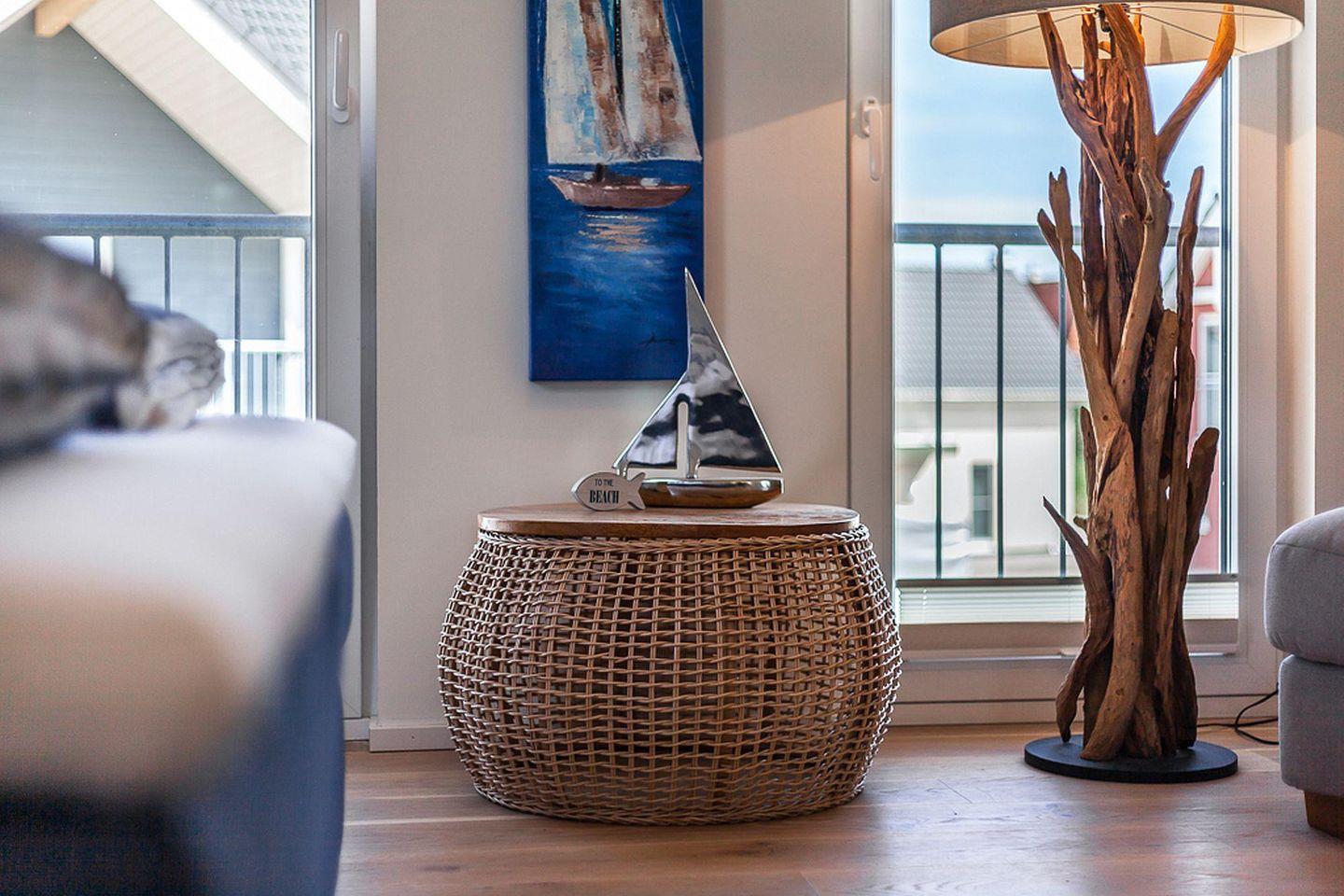 Der Wohnraum mit offener Küche besticht mit seinem nordischen, maritimen Charme und lässt keine Wünsche offen. Ein kuscheliger Lounge-Sessel und ein gemütliches Sofa laden zum Chillen ein. Wenn der Deich in Nebel gehüllt wird, sorgt ein Flatscreen-TV im Wohnbereich für die notwendige Abwechslung.