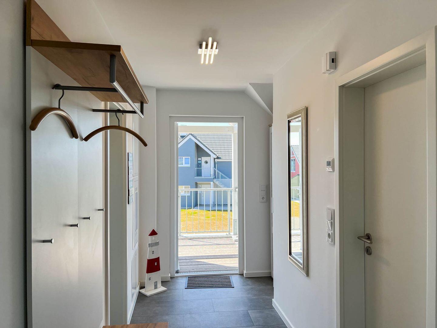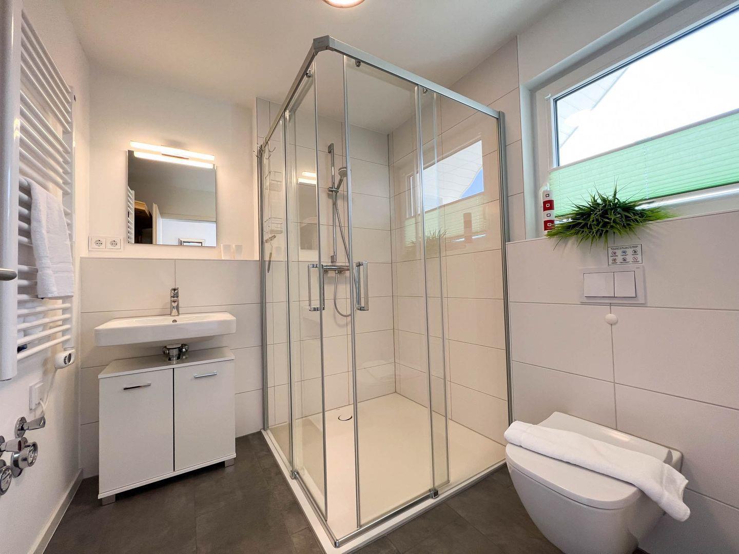 Das Tageslichtbadezimmer verfügt über eine große, ebenerdigen Duschkabine, Waschbecken mit Unterschrank, WC. Außerdem befindet sich hier eine Infrarot-Wärmekabine, in der man sich nach einem Spaziergang an der frischen Nordseeluft entspannen und herrlich durchwärmen lassen kann.