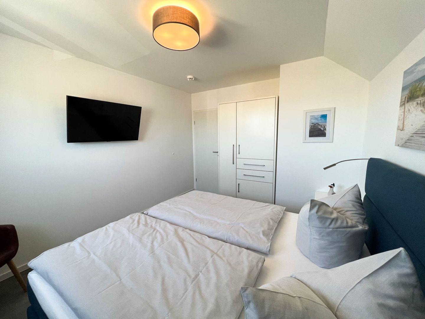 Zur Wohnung gehören zwei Schlafzimmer. Ein Zimmer ist mit einem Doppel Boxspringbett, das andere Schlafzimmer mit 2 Einzel Boxspringbetten ausgestattet, die bei Bedarf einfach zusammengestellt werden können. In beiden Schlafzimmern ist ein Smart-TV vorhanden.