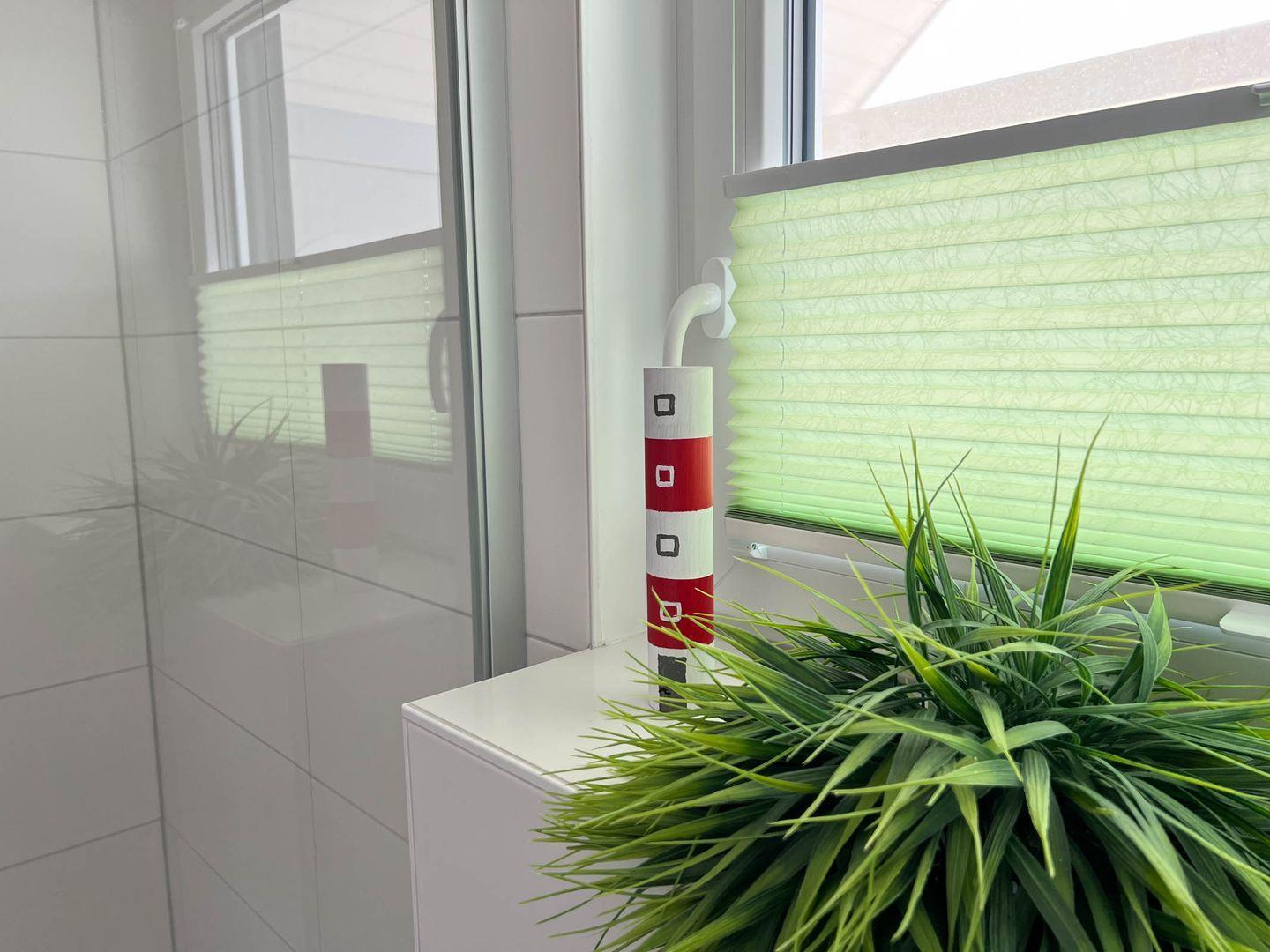 Alle Räume sind mit Plissees und Gardinen zum Sicht- und Sonnenschutz ausgestattet. Die Schlafzimmer verfügen außerdem über Insektenschutzgitter.