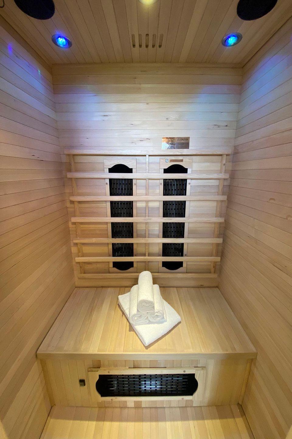 Badezimmer: große ebenerdige Dusche, Handtuchheizung, Infrarotkabine, Föhn, Kosmetikspiegel