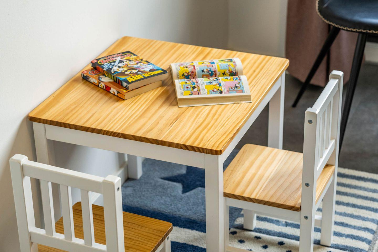 Zur Wohnung gehören zwei Schlafzimmer. Ein Zimmer ist mit einem Doppelbett und einem Fernseher, das zweite mit einem Etagenbett ausgestattet. Letzteres hat bei Bedarf eine Bettschublade für einen fünften Übernachtungsgast (ideal für Familien mit 1-3 Kindern). Für kleinere Kinder kann diese Schublade als Fallschutz genutzt werden. Für Kinder und alle jung gebliebenen liegen Gesellschaftsspiele, Bücher, Puzzle und eine Kiste mit Kapla-Steinen bereit.