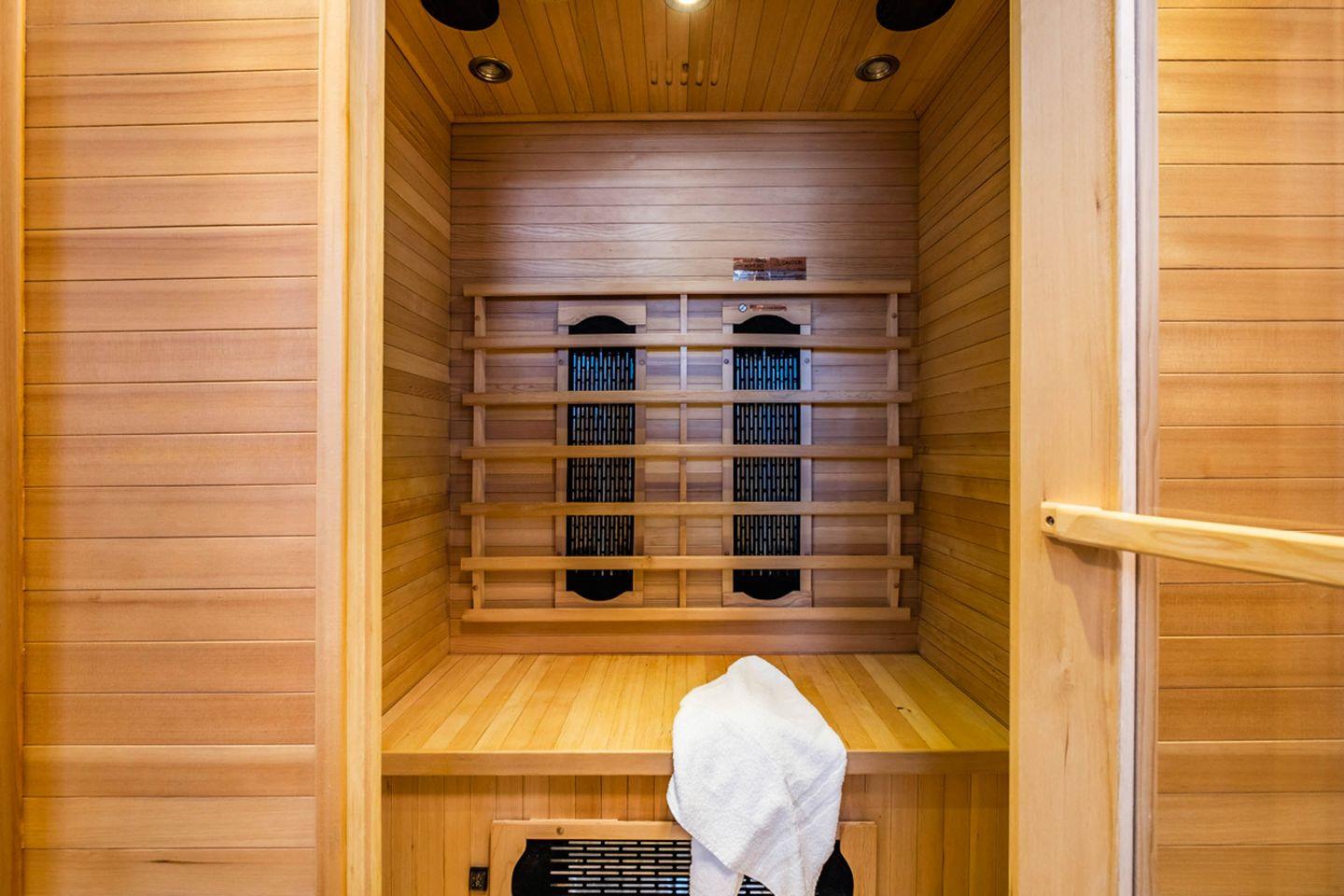 Badezimmer: Duschbad mit Regenwasserdusche, Handtuchheizung, Föhn, Kosmetikspiegel und Infrarotkabine