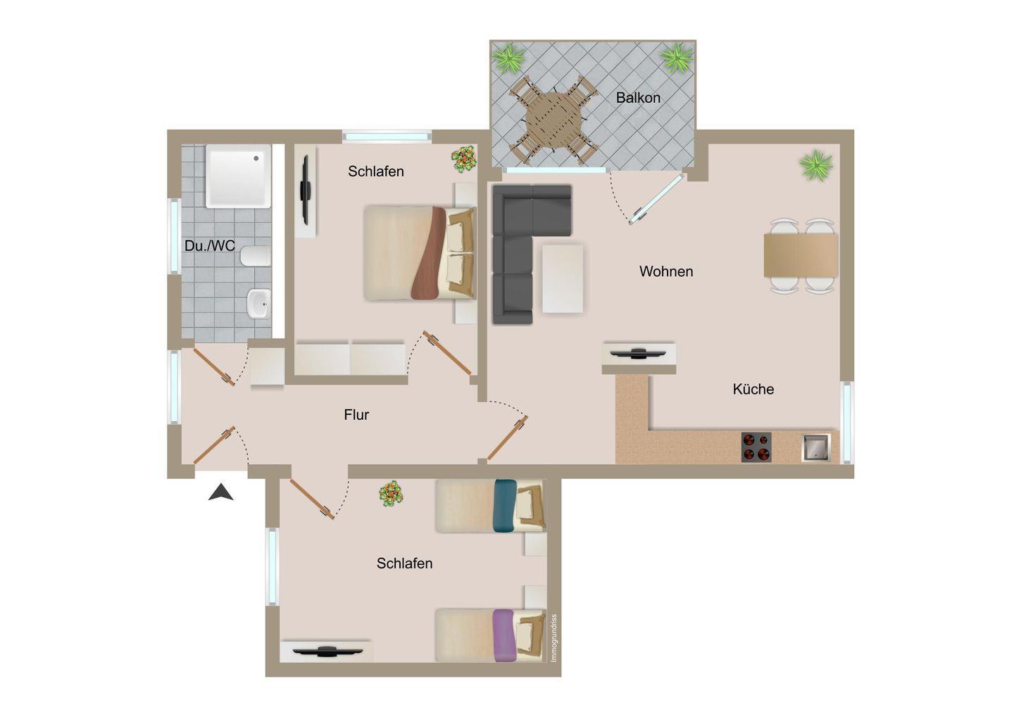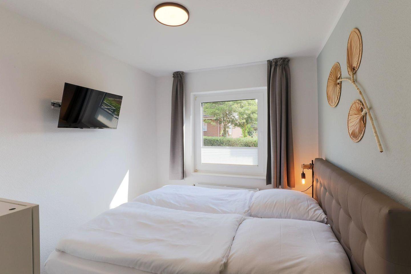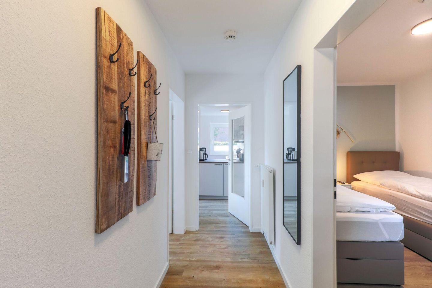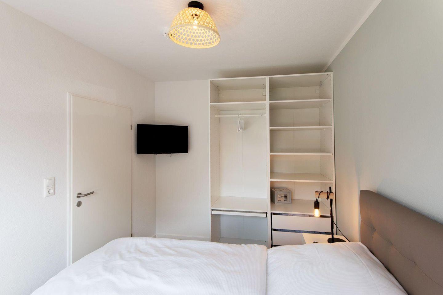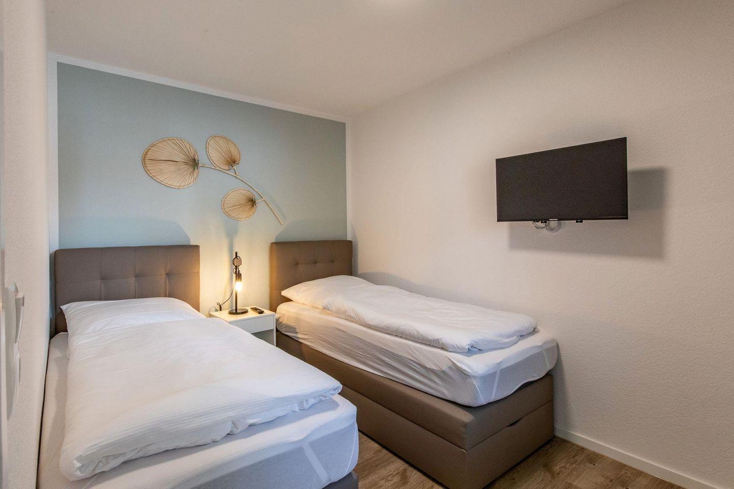 Ein heller Flur empfängt Sie mit einer modernen Garderobe und Zugängen zu sämtlichen Zimmern. Die Ferienwohnung bietet mit 2 Schlafzimmern Platz für 4 Personen. Eines der zwei Schlafzimmer ist mit einem hochwertigen Doppel-Boxspringbett (160 x 200) und ein weiteres mit zwei Einzelboxspringbetten (je 90 x 200) ausgestattet. Die Betten verfügen über Bettkästen, sodass Sie Ihre Koffer für die Urlaubszeit verstauen können. In beiden Schlafzimmern befinden sich wandhängende TV-Flatscreens für den individuellen Fernsehgenuss.