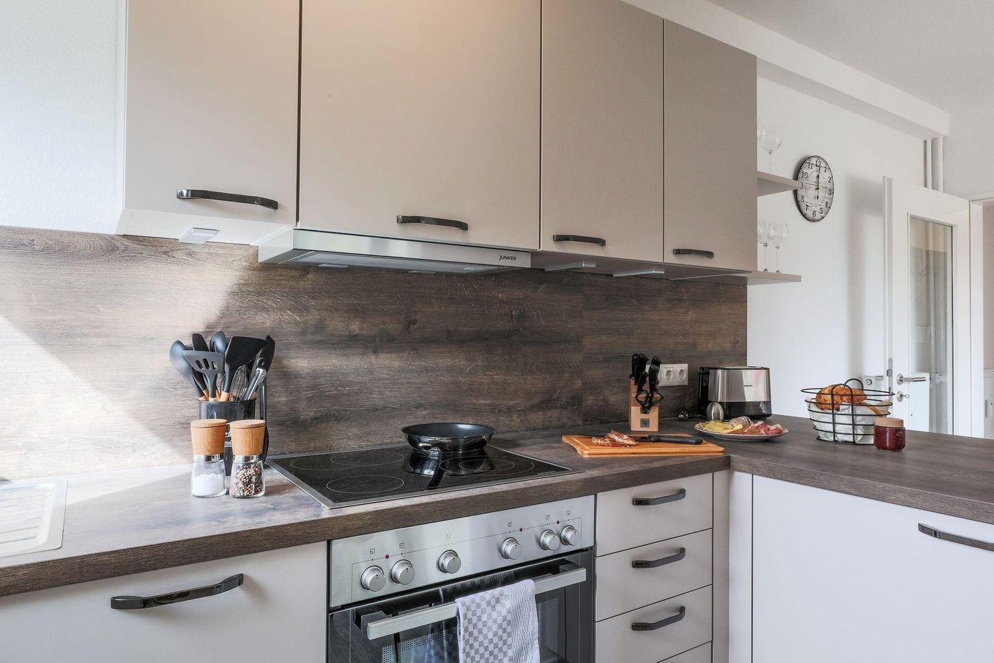 Küchenzeile: Cerankochfeld, Geschirrspüler, Kühlschrank mit Gefrierfach, Filterkaffee, Wasserkocher, Toaster