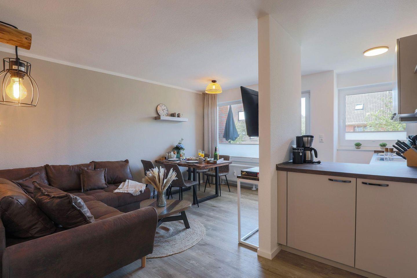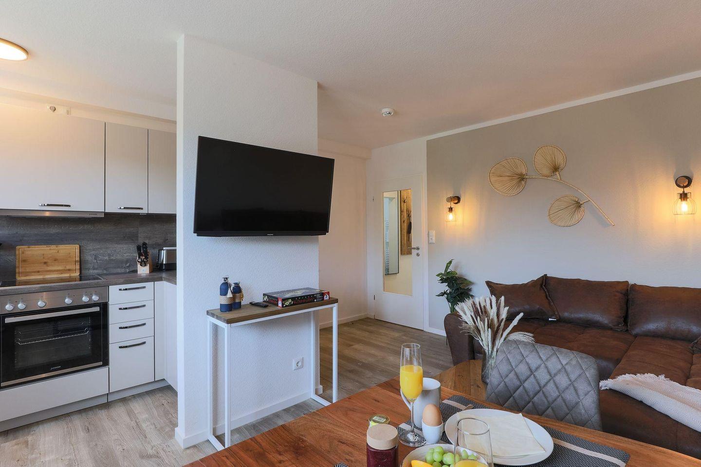 Ein modernes Bad bietet eine komfortable Dusche mit niedrigem Einstieg sowie eine Handtuchheizung. Das Herzstück der Wohnung ist das gemütliche Wohnzimmer mit einer hochwertigen, offenen Küche. Hier finden Sie eine Spülmaschine, ein Cerankochfeld, eine Filterkaffeemaschine und einen Kühlschrank, der mit einem Gefrierfach ausgestattet ist. Ein schöner Essbereich, eine kuschelige Couchgarnitur und ein großer TV-Flatscreen vervollständigen den Wohn-und Küchenbereich. Von dem Wohnbereich gelangen Sie auf einen großzügigen Süd-Westbalkon, ausgestattet mit hochwertigen Balkonmöbeln. Hier können Sie bei einem Glas Wein entspannte Abende mit Ihren Liebsten genießen.