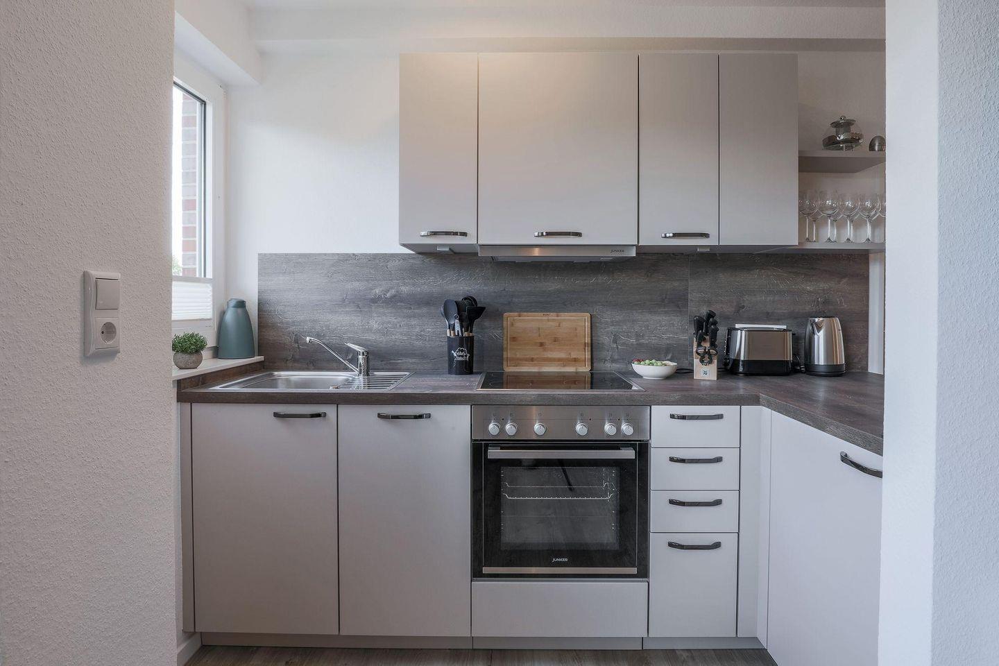 Küchenzeile: Cerankochfeld, Kühlschrank mit Gefrierfach, Filterkaffee, Wasserkocher, Toaster