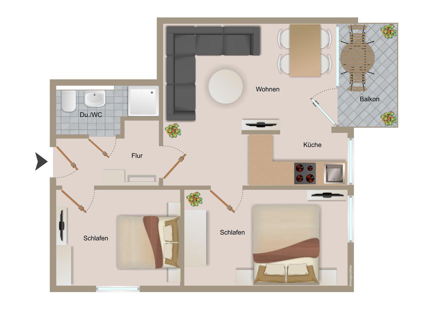 Ein heller Flur empfängt Sie mit einer modernen Garderobe und Zugängen zu sämtlichen Zimmern. Die Ferienwohnung bietet mit 2 Schlafzimmern Platz für 4 Personen. Eines der zwei Schlafzimmer ist mit einem hochwertigen Doppel-Boxspringbett (180 x 200) und ein weiteres mit zwei Einzel-Boxspringbetten (je 90 x 200) ausgestattet. Alle Betten verfügen über Bettkästen, sodass Sie Ihre Koffer für die Urlaubszeit verstauen können. In beiden Schlafzimmern befinden sich wandhängende TV-Flatscreens für den individuellen Fernsehgenuss.