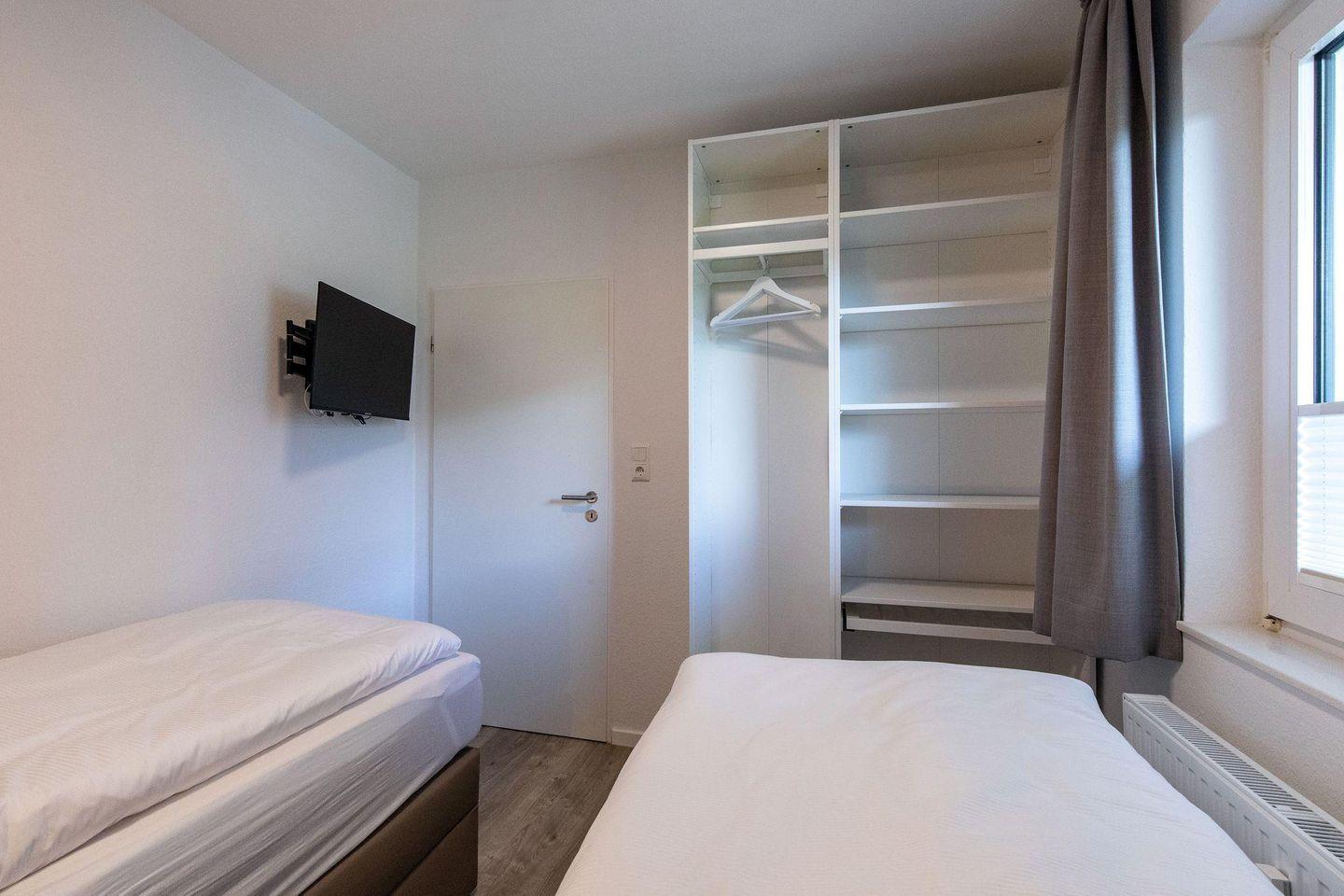 Ein heller Flur empfängt Sie mit einer modernen Garderobe und Zugängen zu sämtlichen Zimmern. Die Ferienwohnung bietet mit 2 Schlafzimmern Platz für 4 Personen. Eines der zwei Schlafzimmer ist mit einem hochwertigen Doppel-Boxspringbett (160 x 200) und ein weiteres mit zwei Einzelboxspringbetten (je 90 x 200) ausgestattet. Alle Betten verfügen über Bettkästen, sodass Sie Ihre Koffer für die Urlaubszeit verstauen können. In beiden Schlafzimmern befinden sich wandhängende TV-Flatscreens für den individuellen Fernsehgenuss.