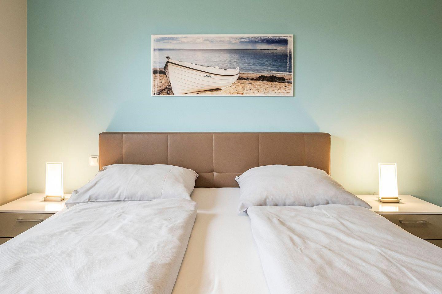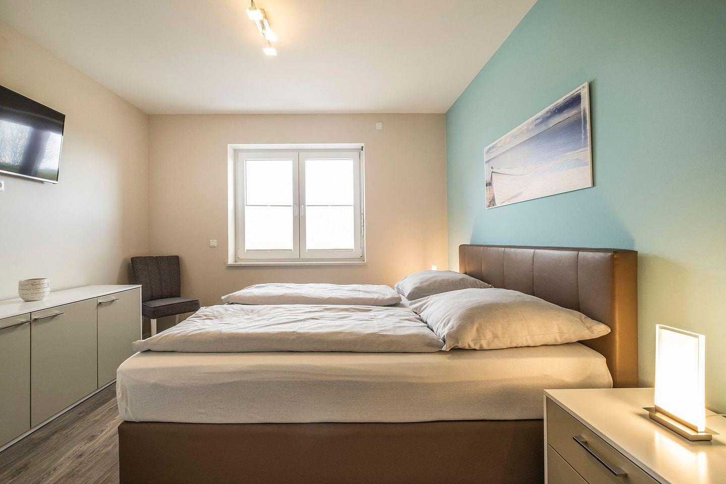 Das erste Schlafzimmer ist mit einem Doppelbett und einem Fernseher ausgestattet, das zweite mit zwei Einzelbetten und einem Fernseher.