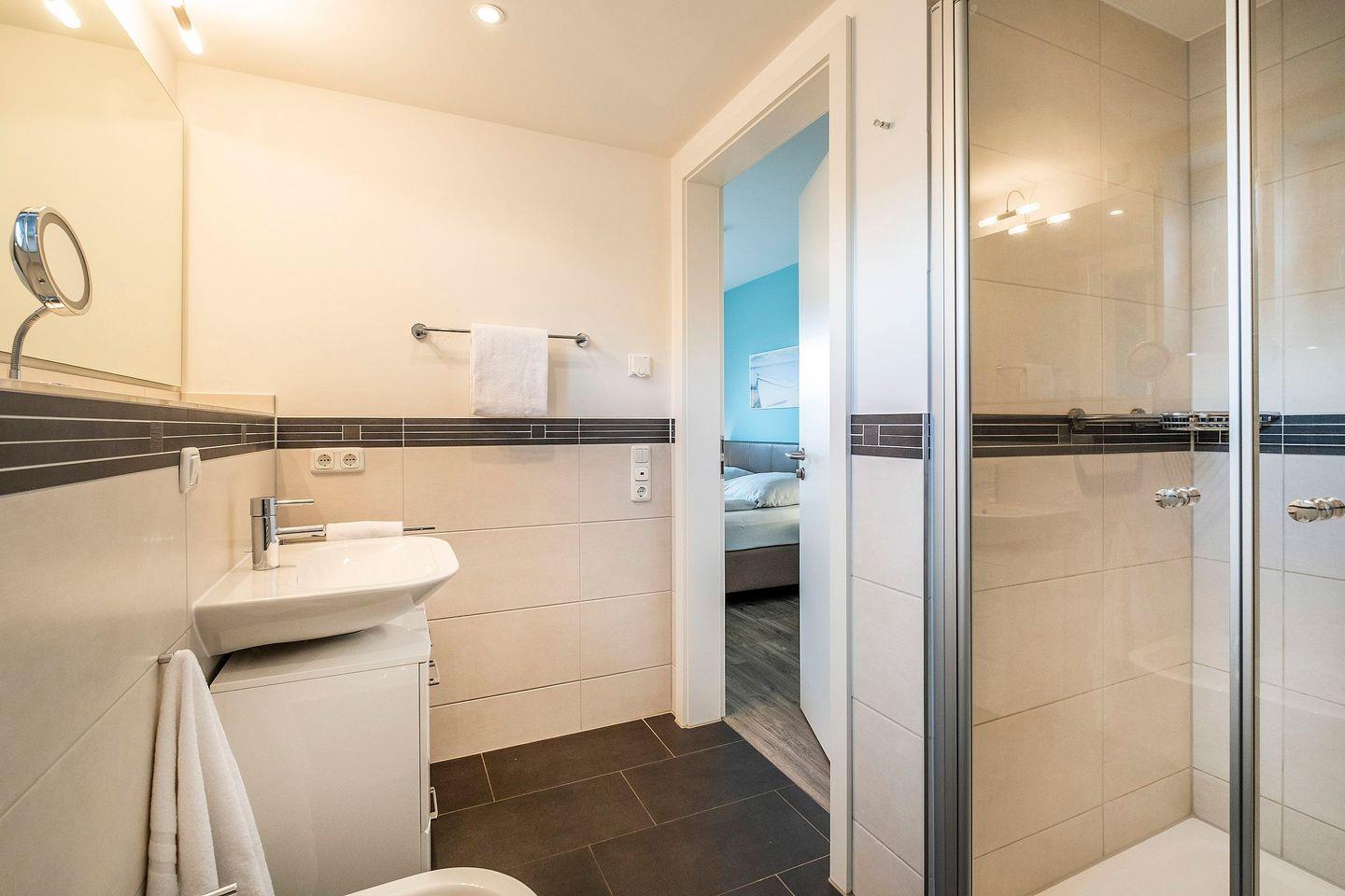 Sanitär: Duschbad mit Dusche (geringer Einstieg), Haar-Föhn, Kosmetikspiegel
