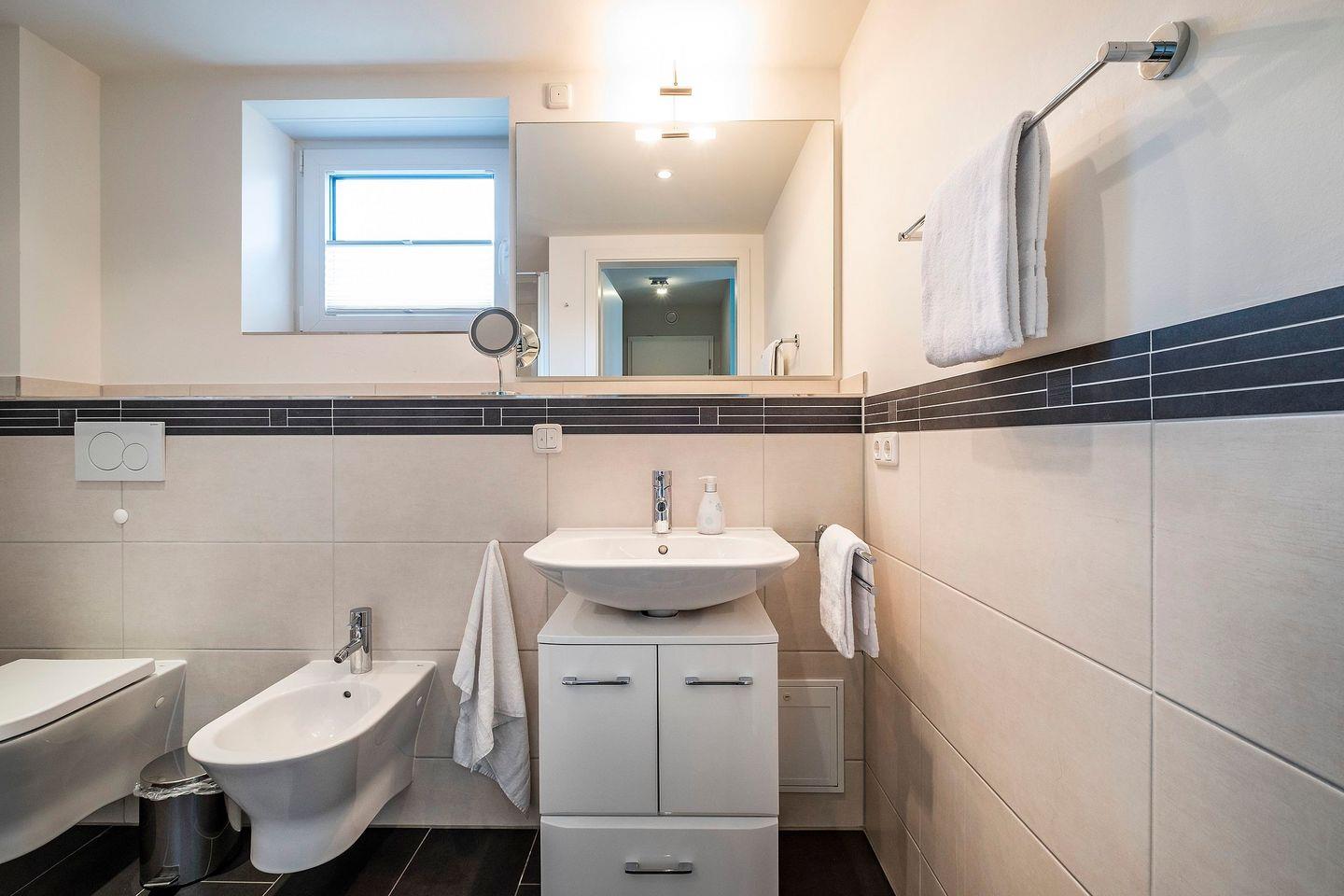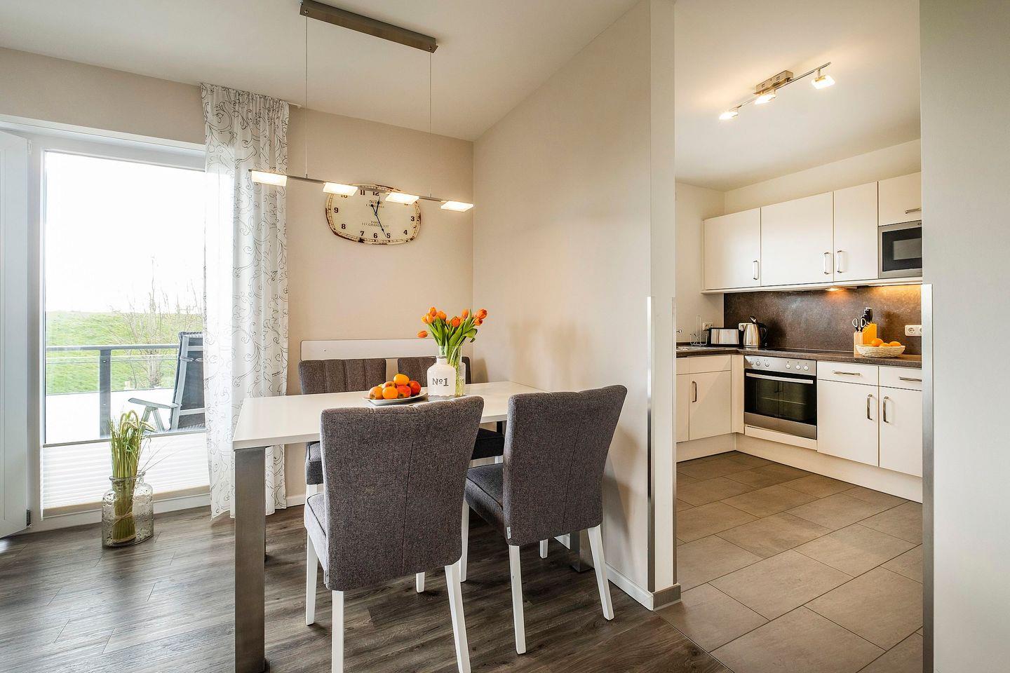 Die Ferienwohnung 1.5 ist eine moderne 3-Raum-Wohnung mit Balkon im I. Obergeschoss. Die Küche ist teils separat und offen zum Wohnzimmer. Der Essbereich ist direkt im Wohnbereich integriert. Das schöne Badezimmer verfügt über eine Dusche mit geringem Einstieg, WC, Bidet, Handtuchtrockner, Duschhocker und Haar-Föhn. Auch verfügt das Appartement über ein Gäste-WC. Vom Wohnbereich gelangen Sie direkt auf den Balkon, der mit Balkonmöbeln ausgestattet ist.