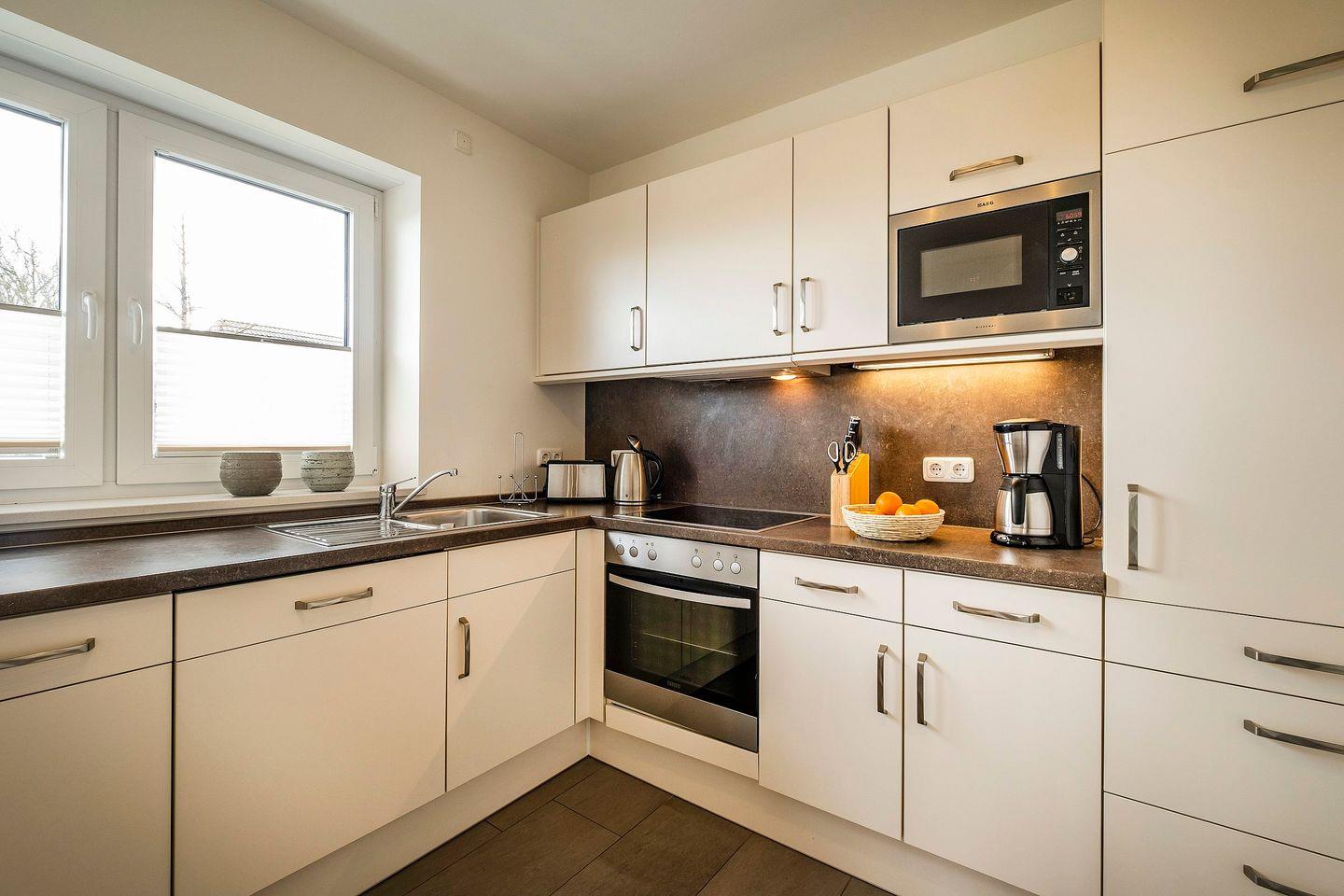Küche: Geschirrspüler, Cerankochfeld, Mikrowelle, Backofen, Kühlschrank mit Gefrierfach.