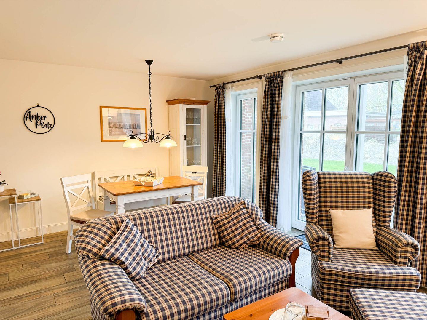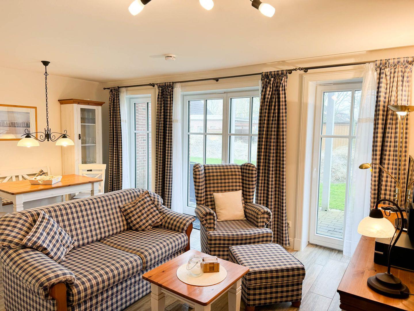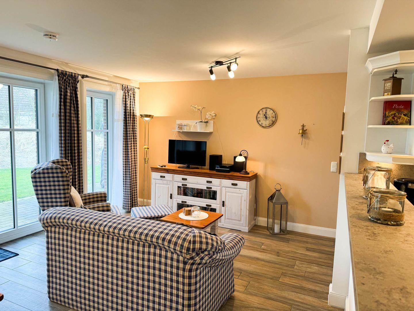 Das Apartment hat eine Größe von 62 m² und befindet sich im Parterre eines gepflegten Reetdach-Gebäudes. Es verfügt über ein helles und geräumiges Wohnzimmer, das harmonisch mit einer offenen Küche verbunden ist. Hier finden Sie alle Kochutensilien sowie einen Herd mit Ceranfeld, einen Backofen, eine Spülmaschine und eine Mikrowelle – ideal für die Zubereitung von köstlichen Mahlzeiten. Der Essbereich lädt zum gemeinsamen Schlemmen und Verweilen ein. Das Wohnzimmer ist mit einem gemütlichen Sofa und Sessel ausgestattet, was den perfekten Rahmen für einen entspannten Fernsehabend mit zwei vorhandenen TVs bietet (einer im Wohnzimmer und einer im Schlafzimmer). Mit dem Smart-TV können Gäste perfekt Radio hören und streamen.