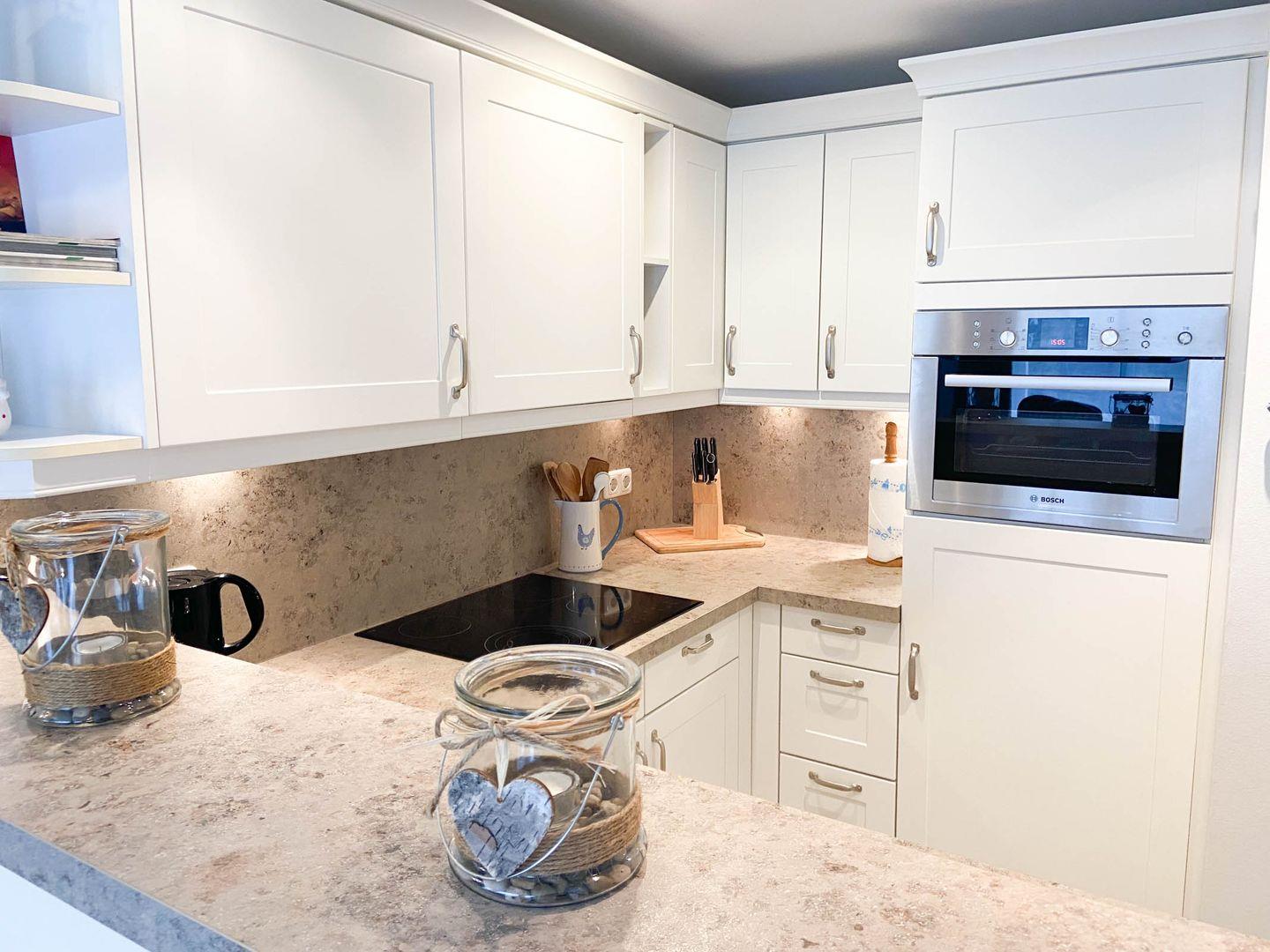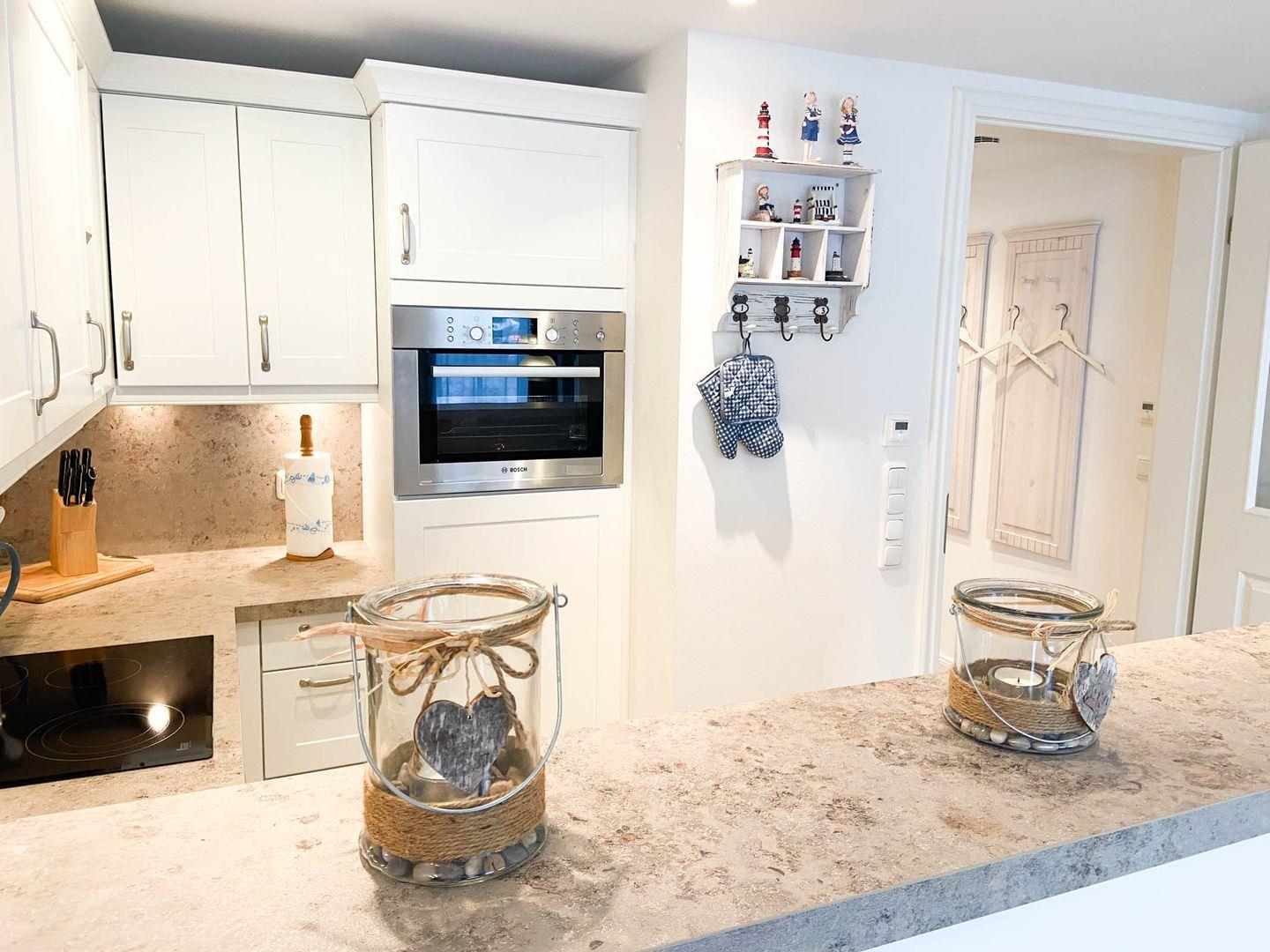 Küche: Backofen, Cerankochfeld, Mikrowelle, Geschirrspüler, Kühl- Gefrierkombination, Kaffeemaschine, Wasserkocher, Toaster