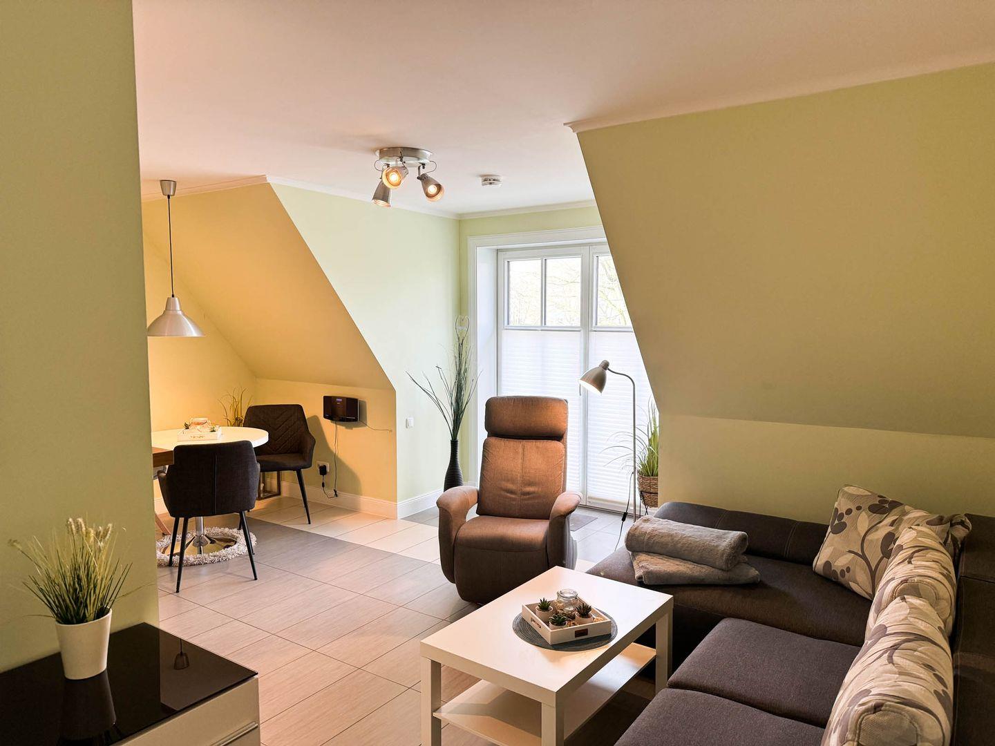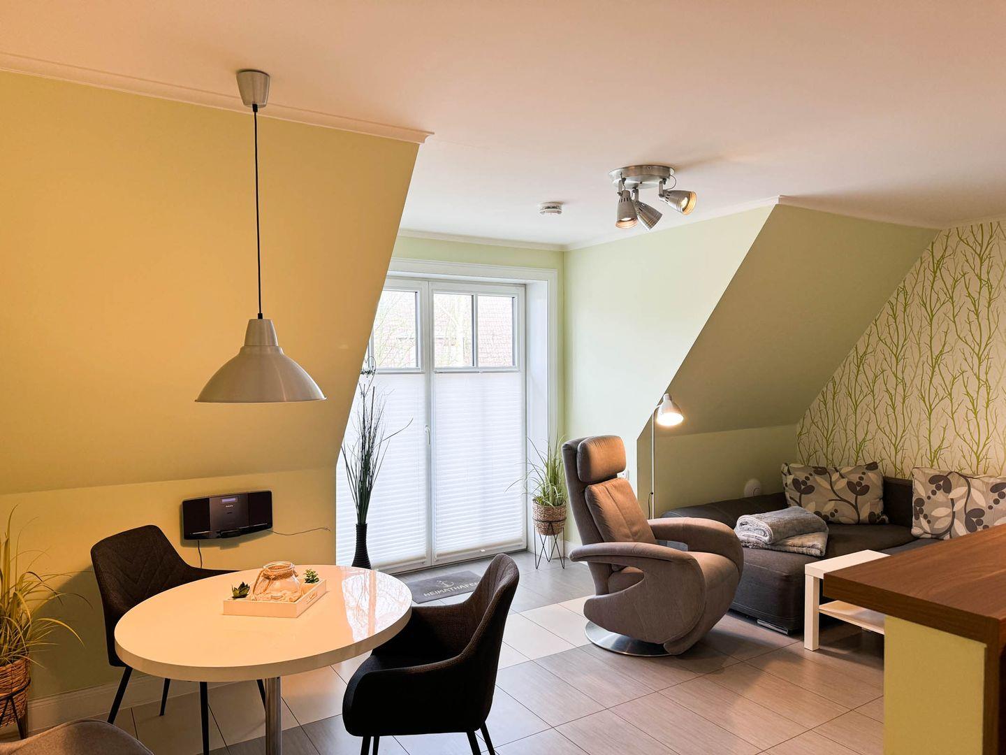 Das Appartement 2.4 befindet sich im I.OG mit Balkon. Im Wohnraum finden Sie eine gemütliche Couchgarnitur und einem Relax- Sessel. Die Küche und der Essbereich sind im Wohnbereich integriert. Das Schlafzimmer ist mit einem Boxspringbett in Komforthöhe und TV ausgestattet. Das Bad verfügt über eine barrierefreie Dusche/WC und Urinal. Fußbodenheizung befindet sich im ganzen Appartement. Einen Balkon erreichen Sie vom Wohnraum und den zweiten vom Schlafzimmer. Das Appartement verfügt über eine Gegensprechanlage mit Kamera. Im Keller finden Sie Waschmaschine und Trockner (gebührenpflichtig), Abstellraum für Fahrräder und einen gemeinschaftlichen Fitnessraum. Aufzug im Haus. Am Haus finden Sie einen weiteren abschließbaren Fahrradabstellraum und einen kleinen Spielplatz für unsere kleinen Gäste.