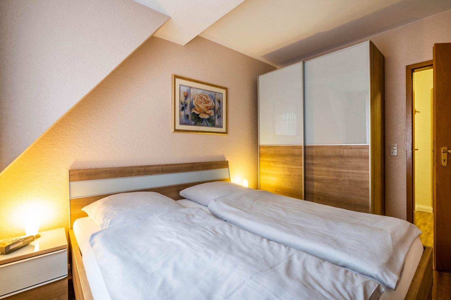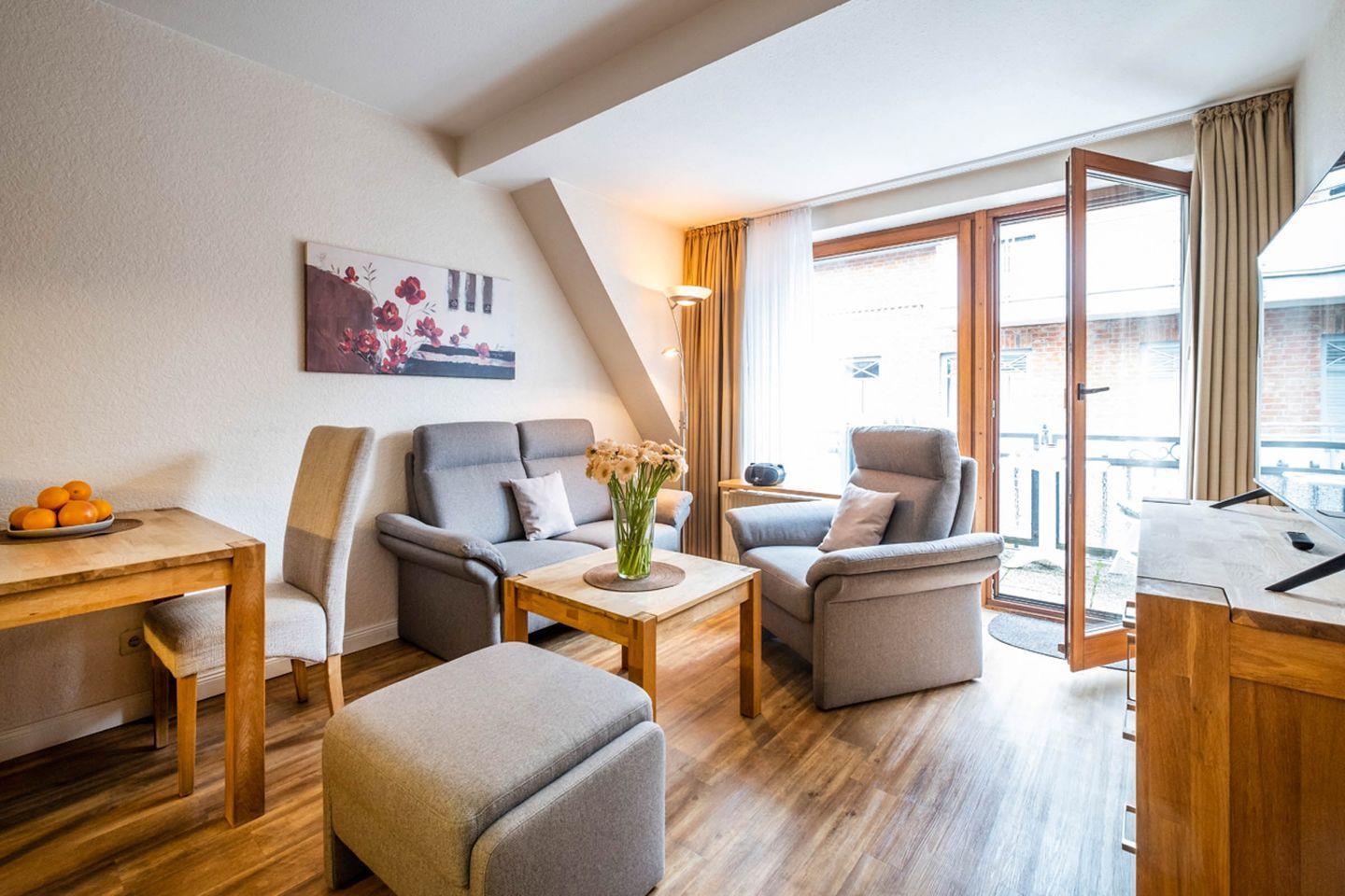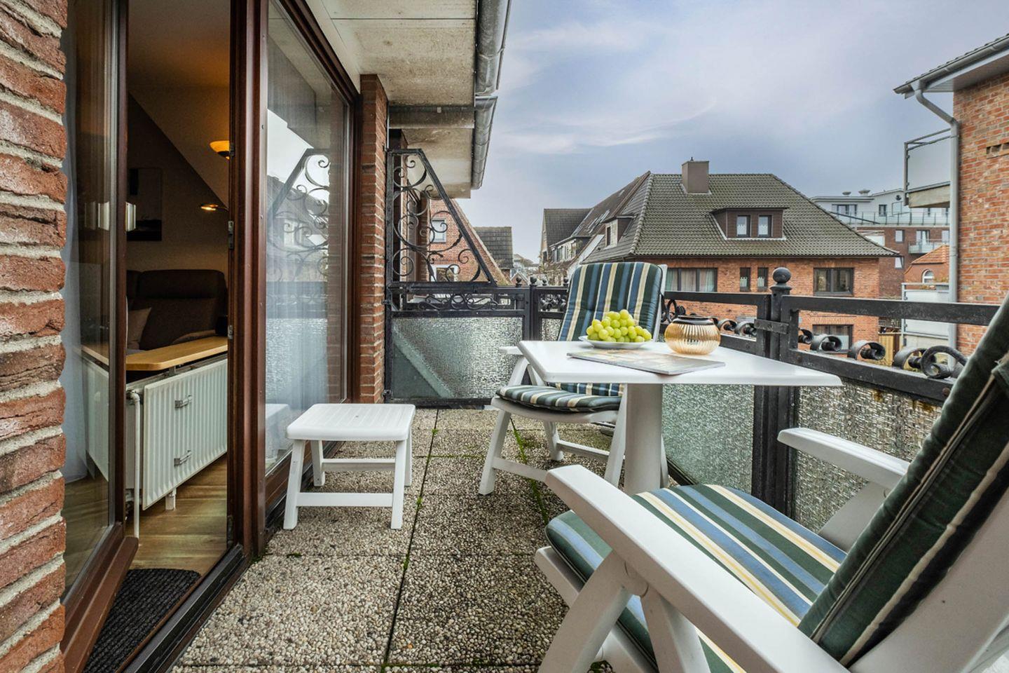 Die Ferienwohnung 5 liegt im 1. Obergeschoss und verfügt über einen Balkon in West-Lage. Es gibt leider keinen Aufzug im Haus.