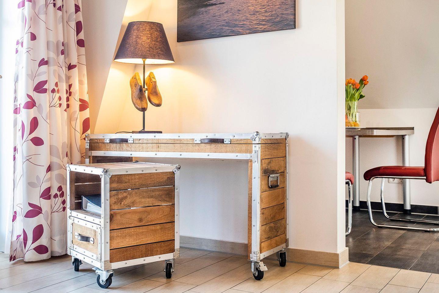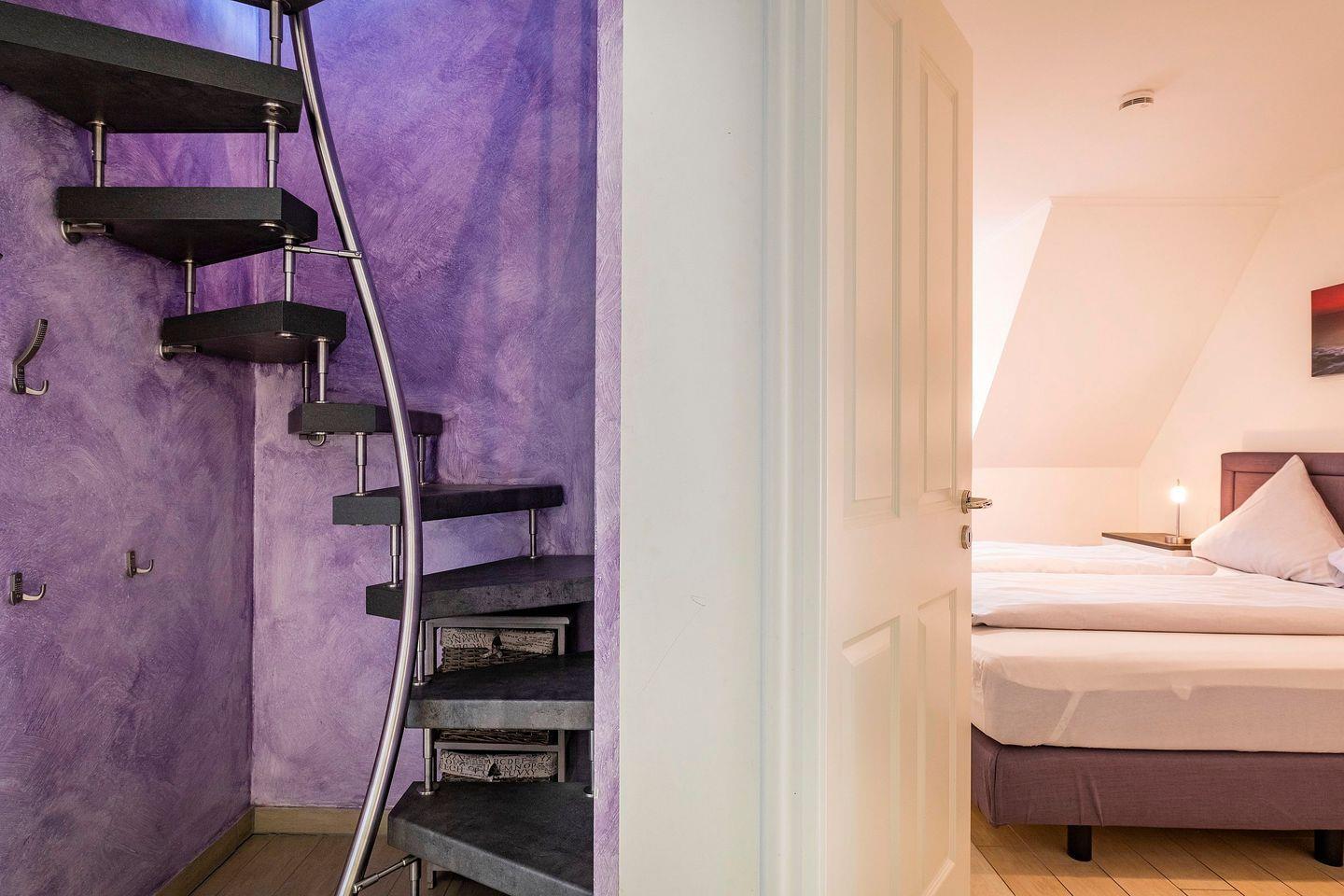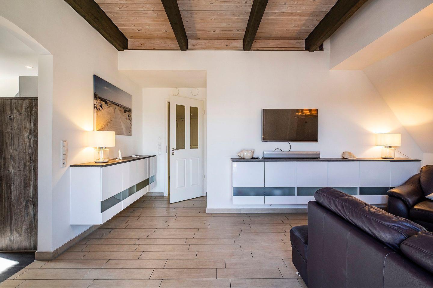 Das Appartement 3.3 befindet sich im Dachgeschoß mit Balkon. Im Wohnraum finden Sie eine gemütliche Couchgarnitur mit einem Sessel. Die Küche und der Essbereich sind im Wohnbereich integriert. Das Schlafzimmer ist mit einem Boxspringbett in Komforthöhe und TV ausgestattet. Das Bad verfügt über eine Badewanne mit Glas-Duschwand. Im Appartement erreichen Sie über eine Wendeltreppe den oberen Bereich, der mit Spielteppich, Spielzeug und Schlafsofa für ein Kind ausgestattet ist. Fußbodenheizung befindet sich im ganzem Appartement. Den Balkon erreichen Sie vom Wohnraum. Das Appartement verfügt über eine Gegensprechanlage mit Kamera. Im Keller finden Sie Waschmaschine und Trockner (gebührenpflichtig), Abstellraum für Fahrräder und einen gemeinschaftlichen Fitnessraum. Aufzug im Haus. Am Haus finden Sie einen weiteren abschließbaren Fahrradabstellraum und einen kleinen Spielplatz für unsere kleinen Gäste.