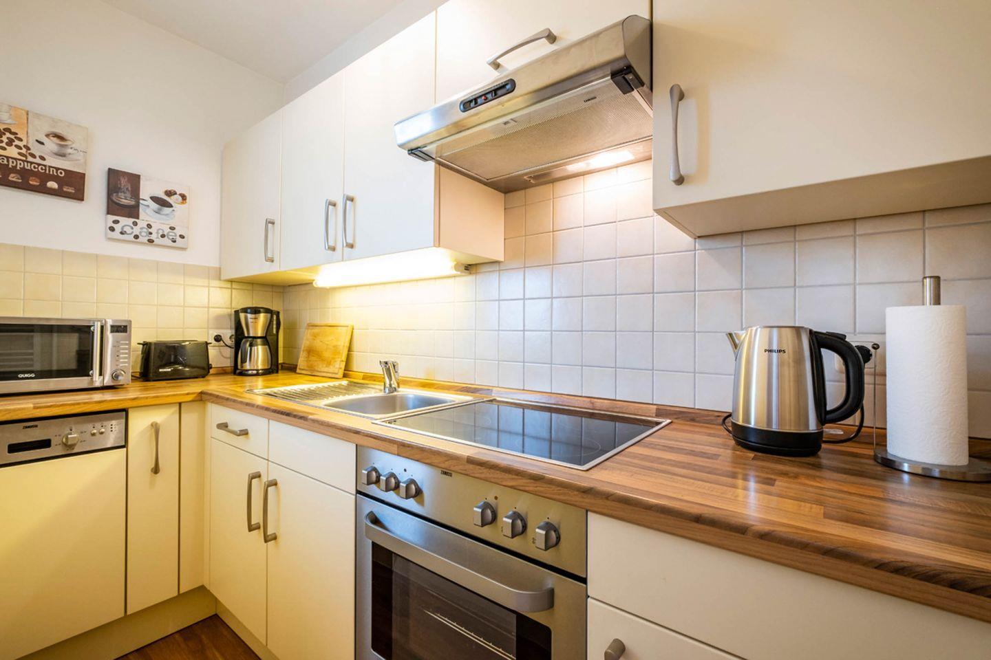 Küchenzeile: 4 Platten-Herd, Mikrowelle, Geschirrspüler, Kühlschrank mit Gefrierfach