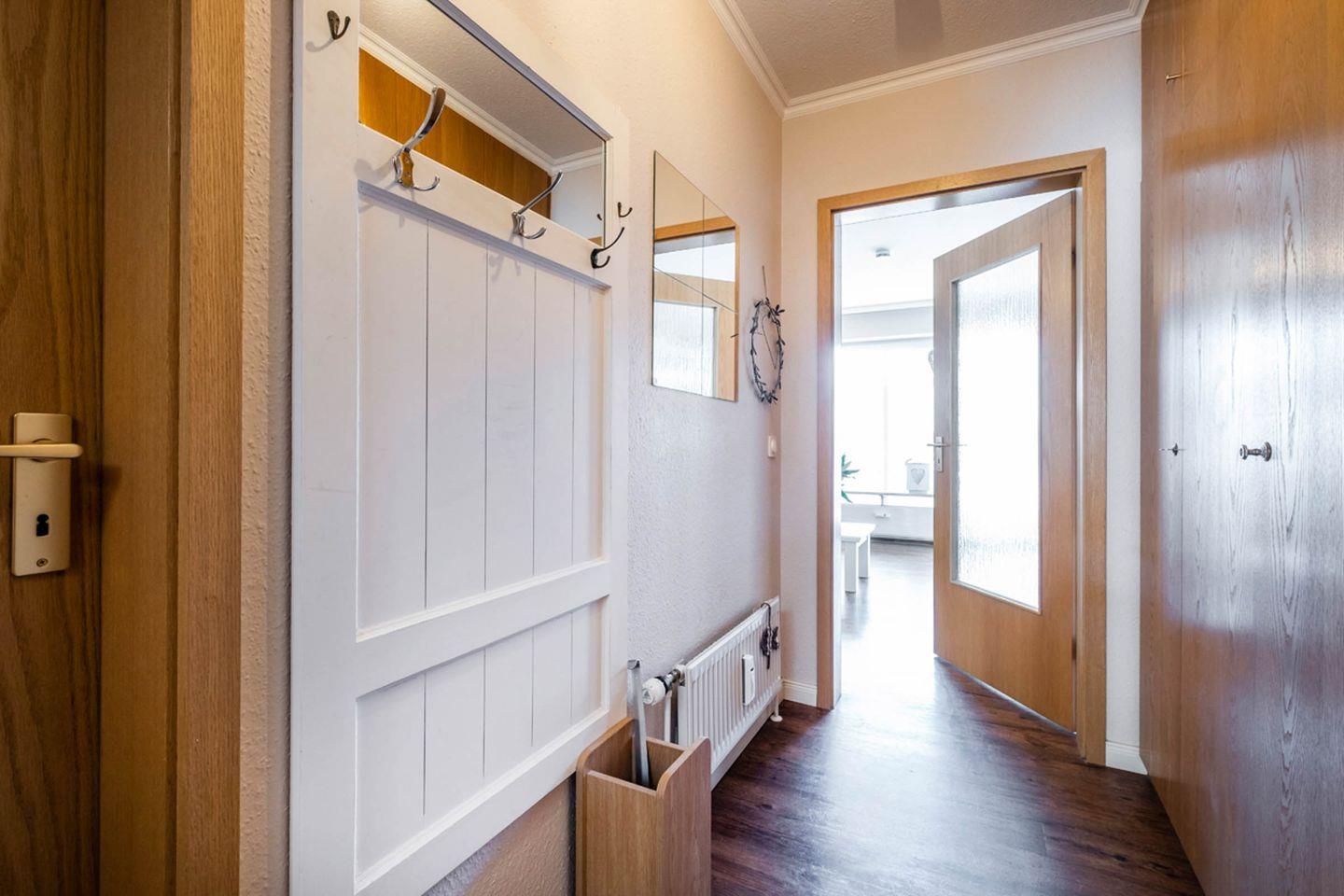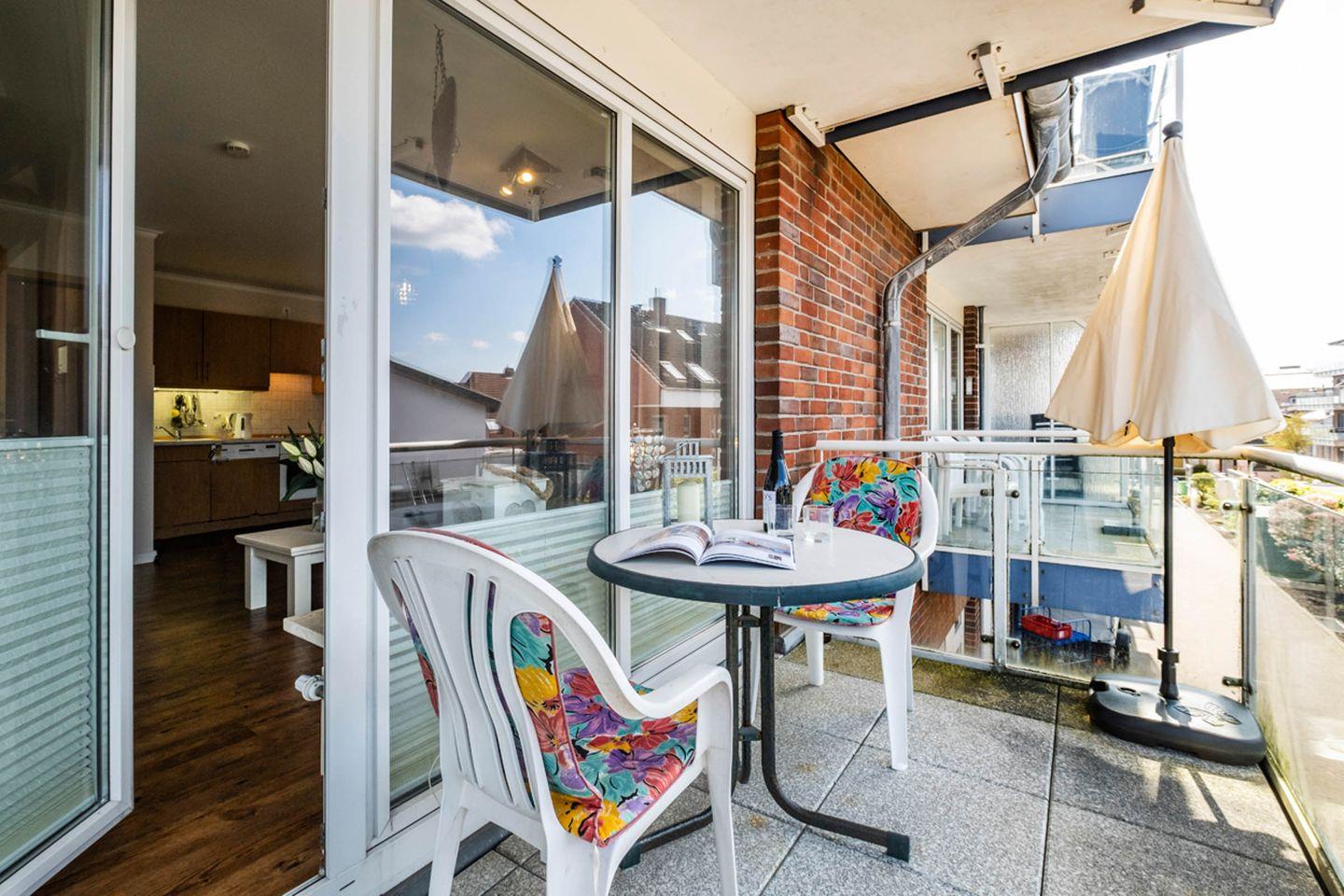 Die Ferienwohnung 2.3 (41qm) liegt im 1. Obergeschoss und verfügt über einen Balkon in Süd-West-Lage. Ein Aufzug befindet sich im Haus.