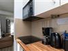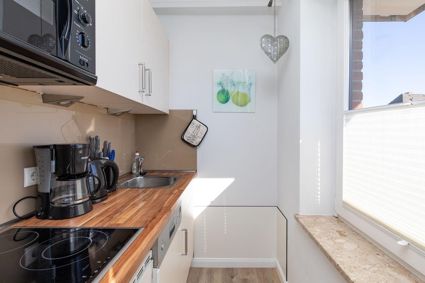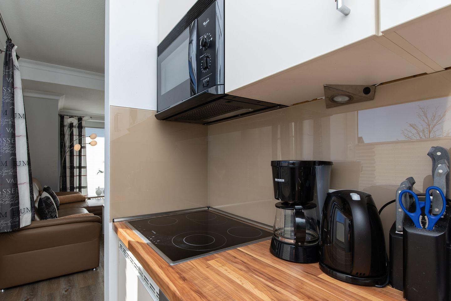 Küchenzeile: Geschirrspüler, Kochfeld, Mikrowelle, Kühlschrank mit Gefrierfunktion, Heißwasserkocher, Kaffeemaschine, Toaster.