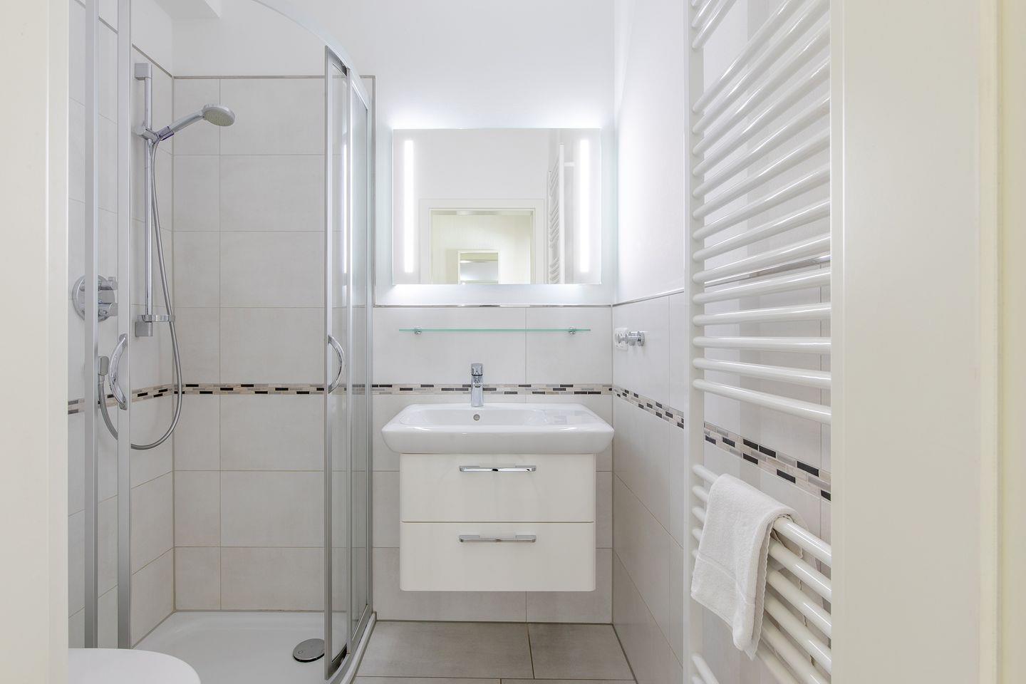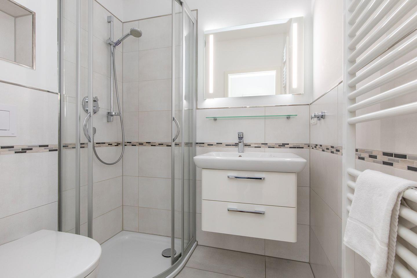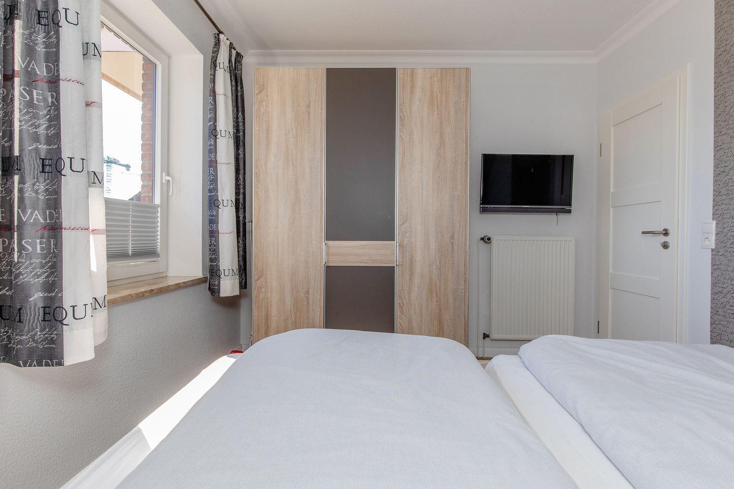 Das Bad verfügt über eine Dusche/WC. Vom Wohnbereich gelangen Sie auf den Balkon. Das eine Schlafzimmer verfügt über ein Doppelbett und einen Fernseher, das zweite Schlafzimmer über 2 Einzelbetten mit einem Fernsehgerät. Der Wohnung ist ein PKW - Stellplatz direkt am Haus zugehörig.