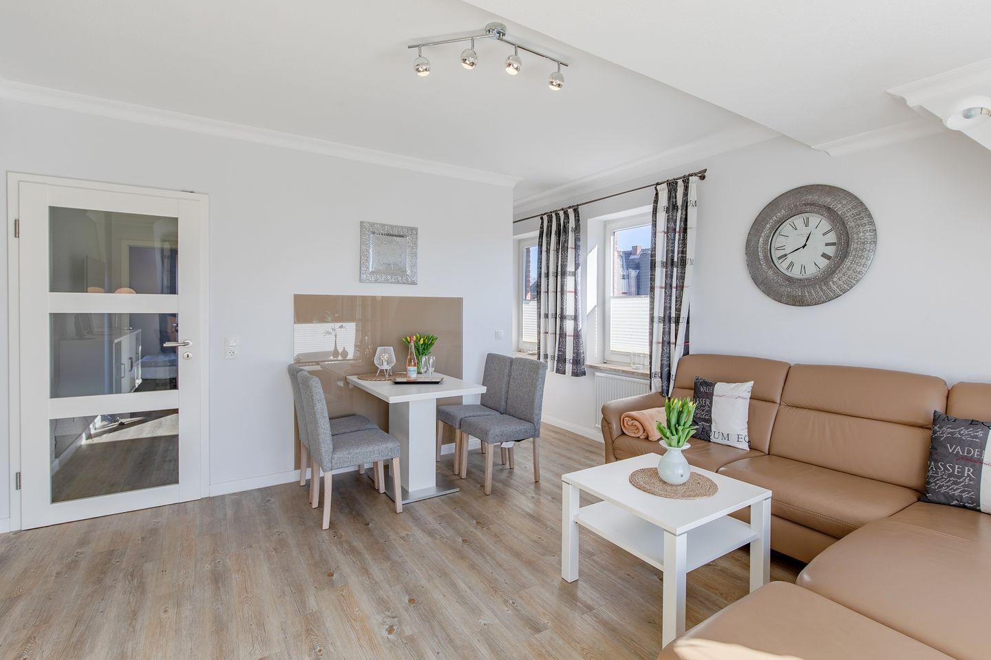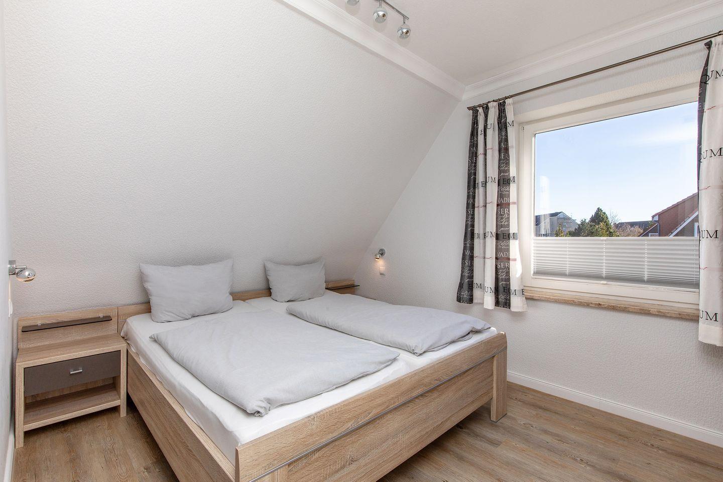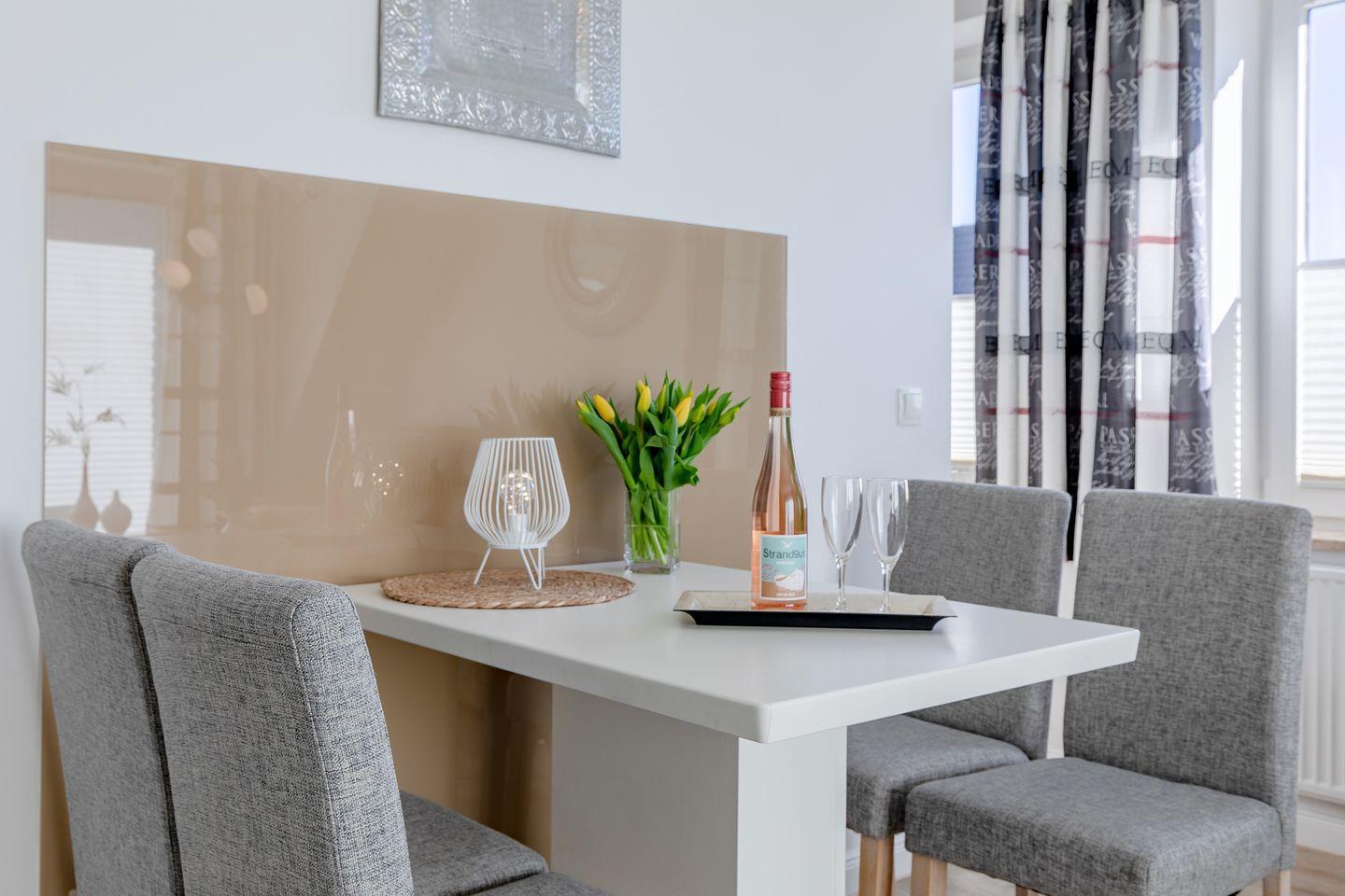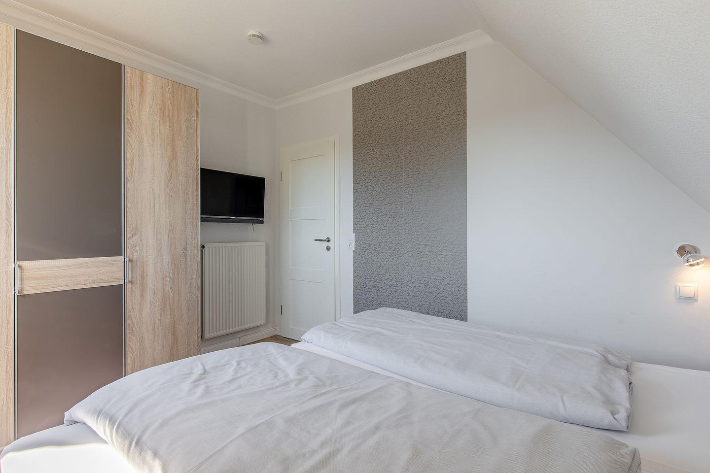 Die Wohnung Haus Hoch am Wind Wohnung 4 bietet auf 46 m² Platz für bis zu vier Personen und liegt nur 250 Meter vom Strand entfernt. Zwei Schlafzimmer, ein bodengleiches Duschbad, ein offener Wohn- und Essbereich sowie ein Balkon schaffen ein komfortables Ambiente. WLAN, eine gut ausgestattete Küche mit Spülmaschine, drei TVs und ein Privatparkplatz ergänzen die hochwertige Ausstattung.