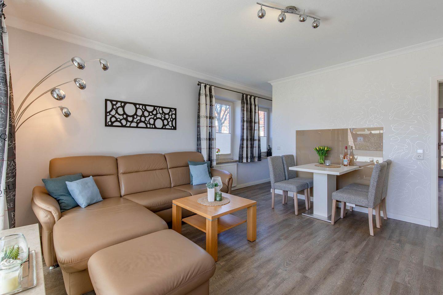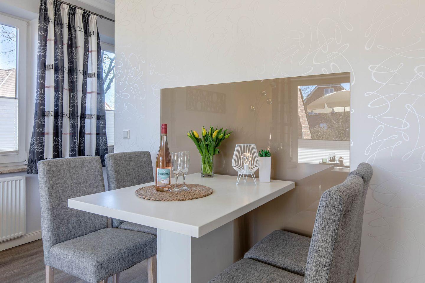 Haus Hoch am Wind Wohnung 3 in Büsum bietet auf 41 m² eine komfortable Unterkunft für zwei Personen. Die Ferienwohnung im Parterre verfügt über eine offene Küche mit moderner Ausstattung, ein separates Schlafzimmer, einen Wohnbereich sowie eine Terrasse mit Gartenmöbeln. WLAN, TV, Spülmaschine und ein Privatparkplatz stehen zur Verfügung. Strand, Einkaufsmöglichkeiten und Restaurants sind nur 250 Meter entfernt. Haustiere sind nach Absprache erlaubt.
