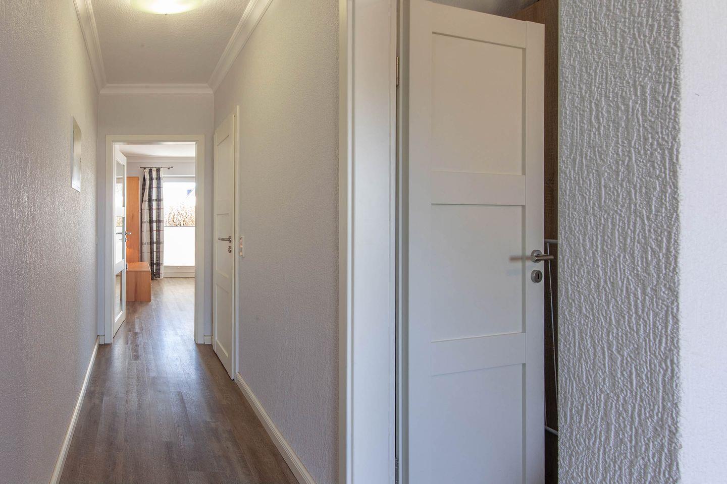 Die Ferienwohnung 3 (41 qm) liegt im Erdgeschoss (separater Eingang rechts) und verfügt über eine Terrasse in West-Lage.