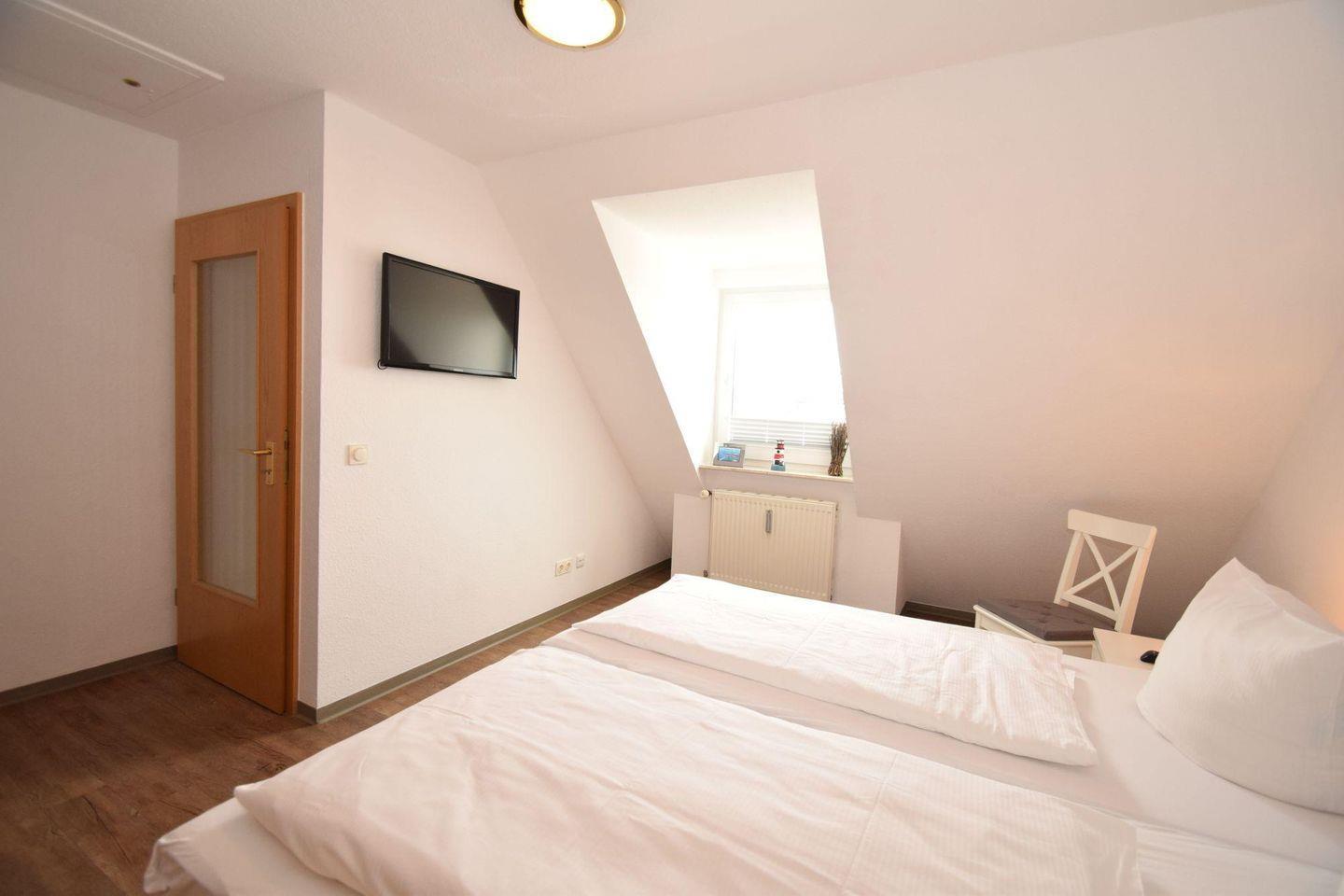 Im oberen Bereich der Wohnung (über eine Treppe zu erreichen) befindet sich 1 Schlafzimmer mit einem Ehebett sowie 1 Gäste-WC.