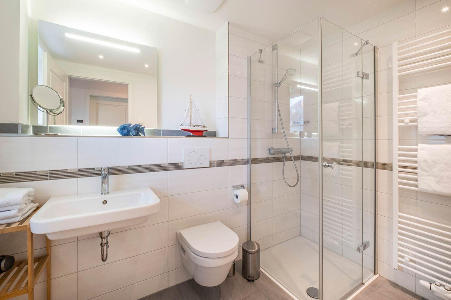 Sanitär: Duschbad mit ebenerdiger Dusche, Haar-Föhn, Kosmetikspiegel