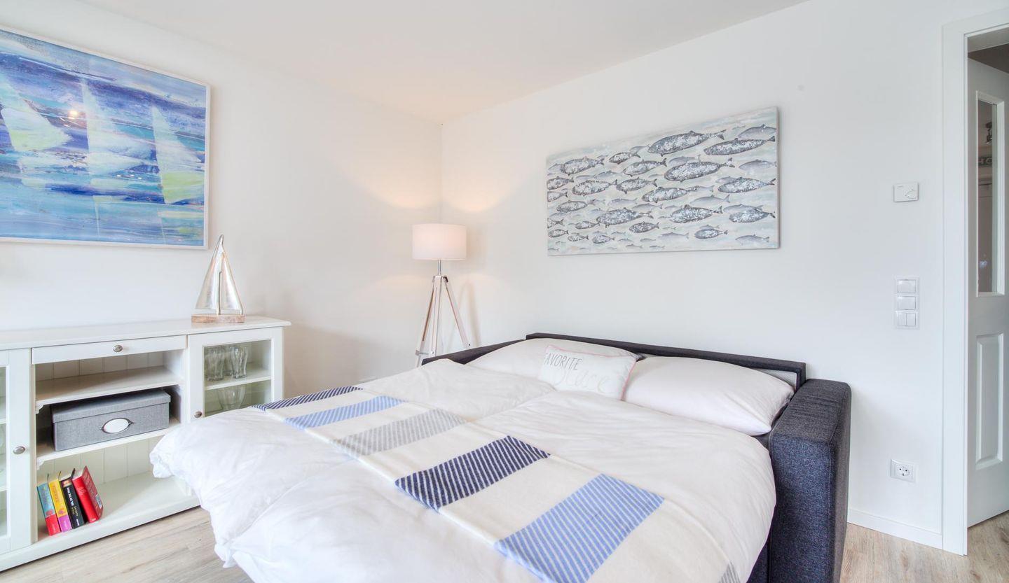 Die Ferienwohnung 2.5 ist eine helle, im maritimen Stil eingerichtete 2-Raum-Wohnung mit Balkon. Die Küchenzeile und der Essbereich sind direkt im Wohnbereich integriert. Das Bad verfügt über eine ebenerdige Dusche, WC, Handtuchtrockner und Haar-Föhn. Vom Wohnbereich gelangen Sie direkt auf den Balkon.