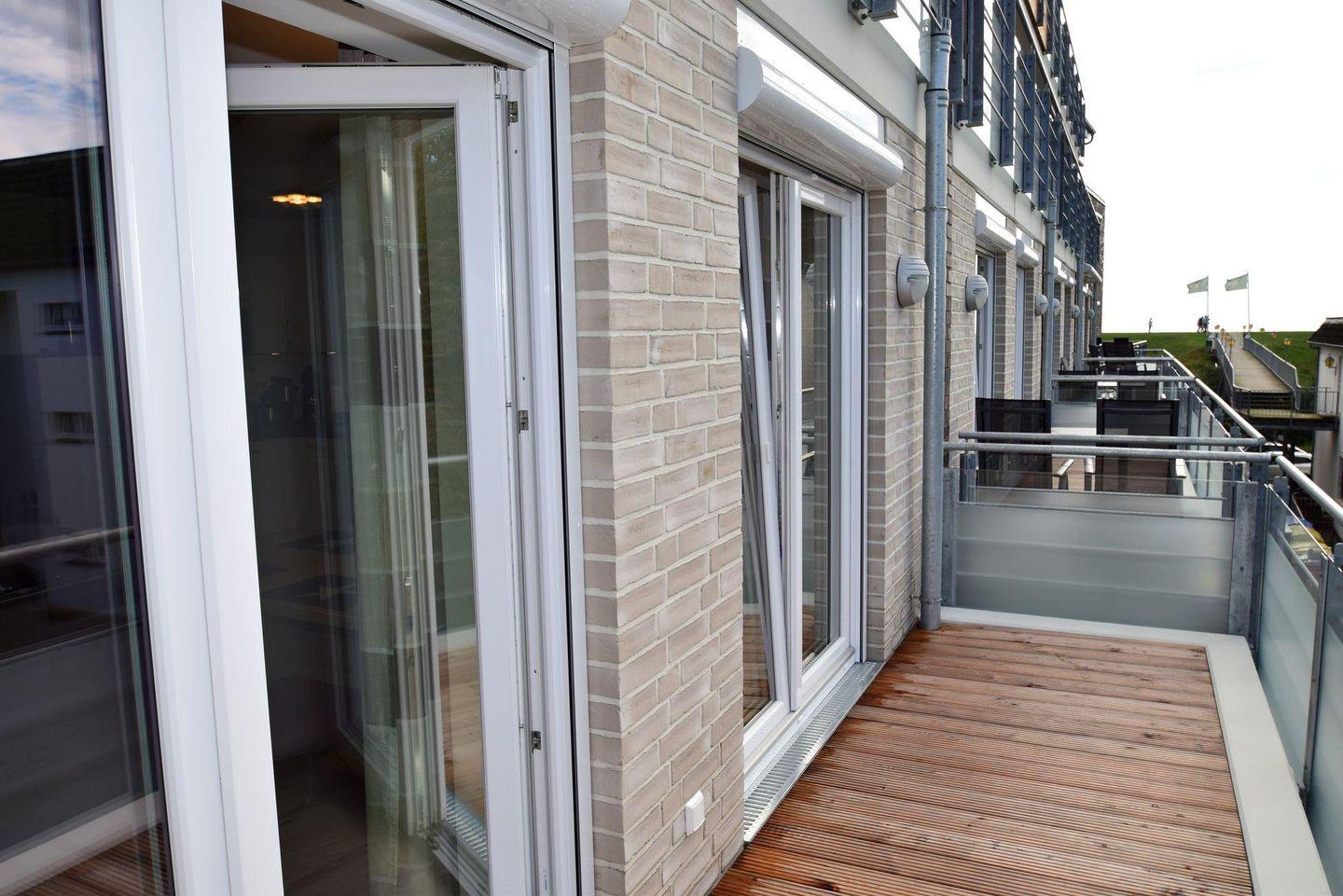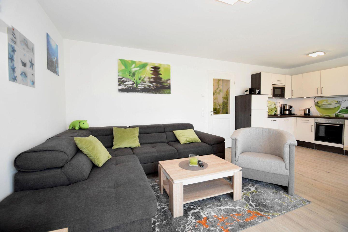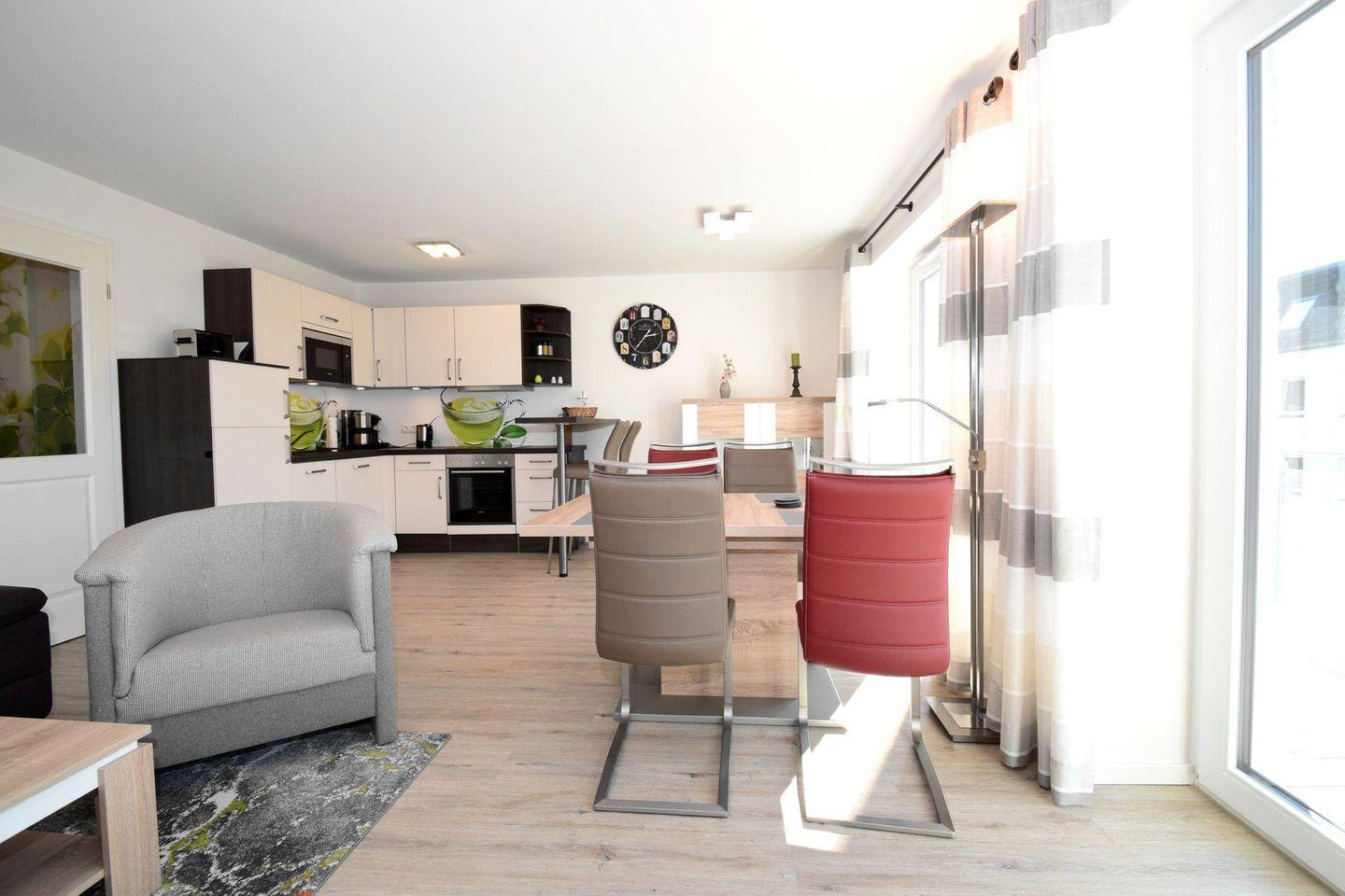 Die Ferienwohnung 2.6 ist eine schöne 2-Raum-Wohnung mit Balkon. Die Küchenzeile und der Essbereich sind direkt im Wohnbereich integriert. Das Bad verfügt über eine ebenerdige Dusche, WC, Handtuchtrockner und Haar-Föhn. Vom Wohnbereich gelangen Sie direkt auf den Balkon.