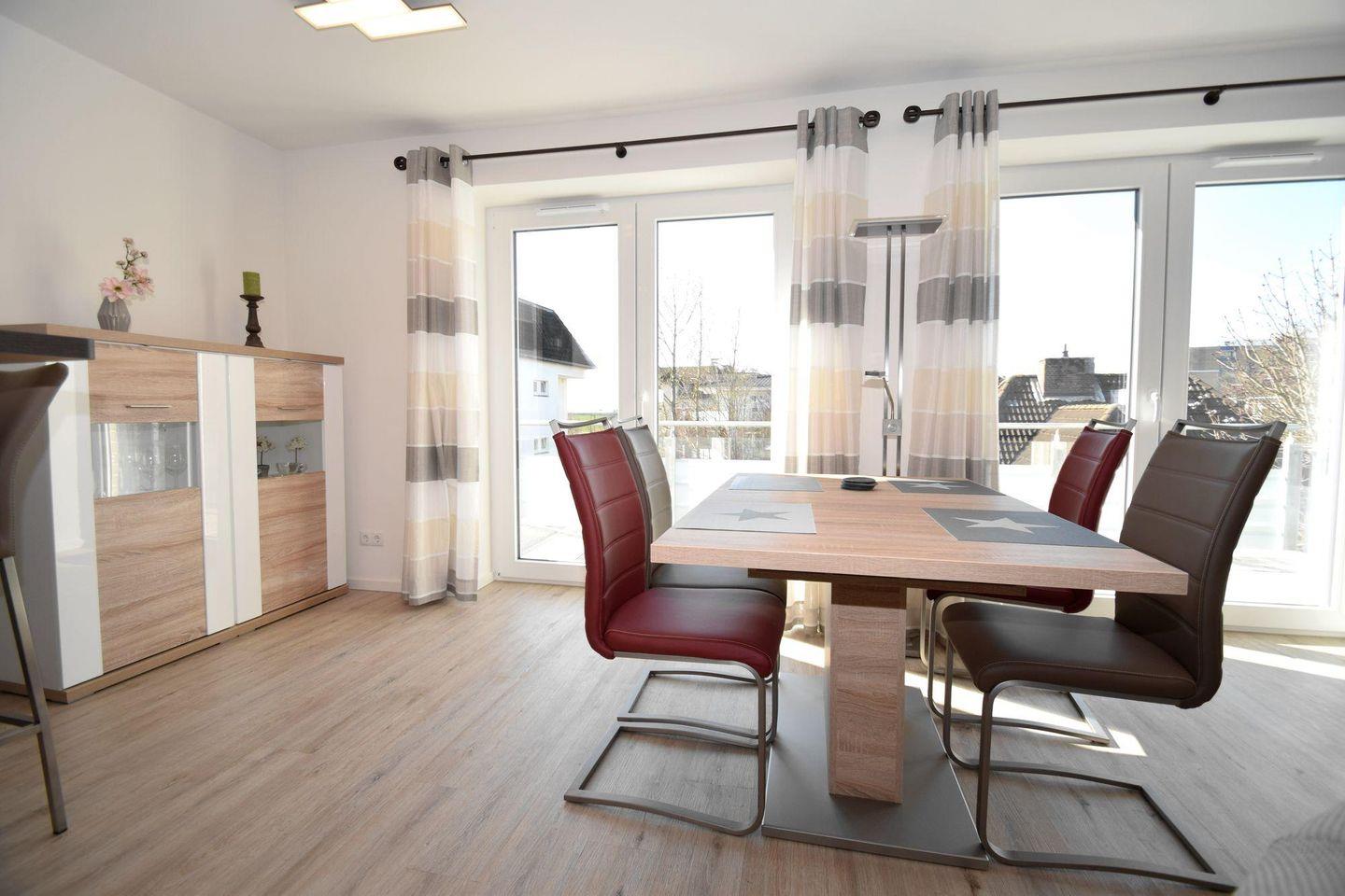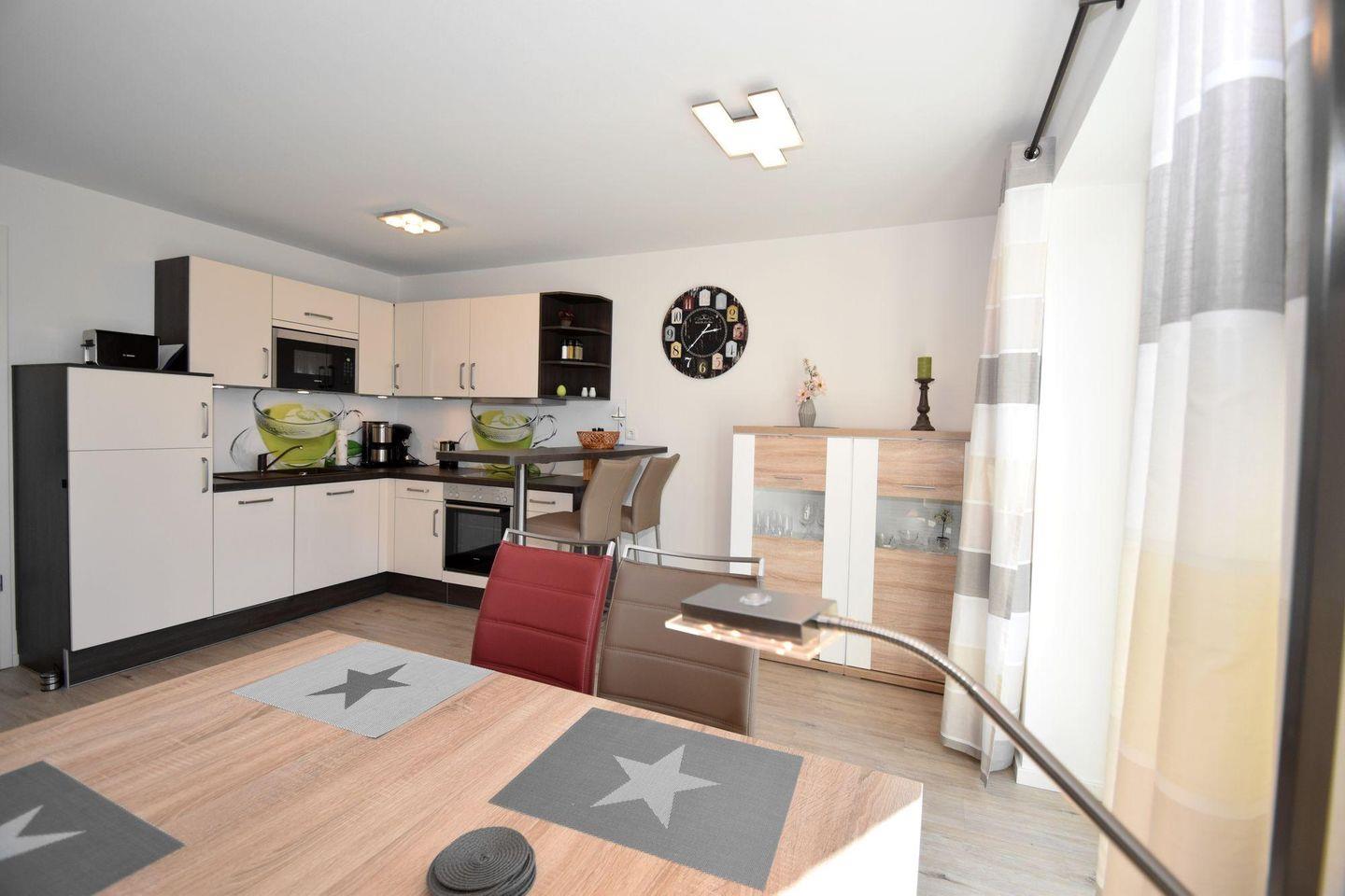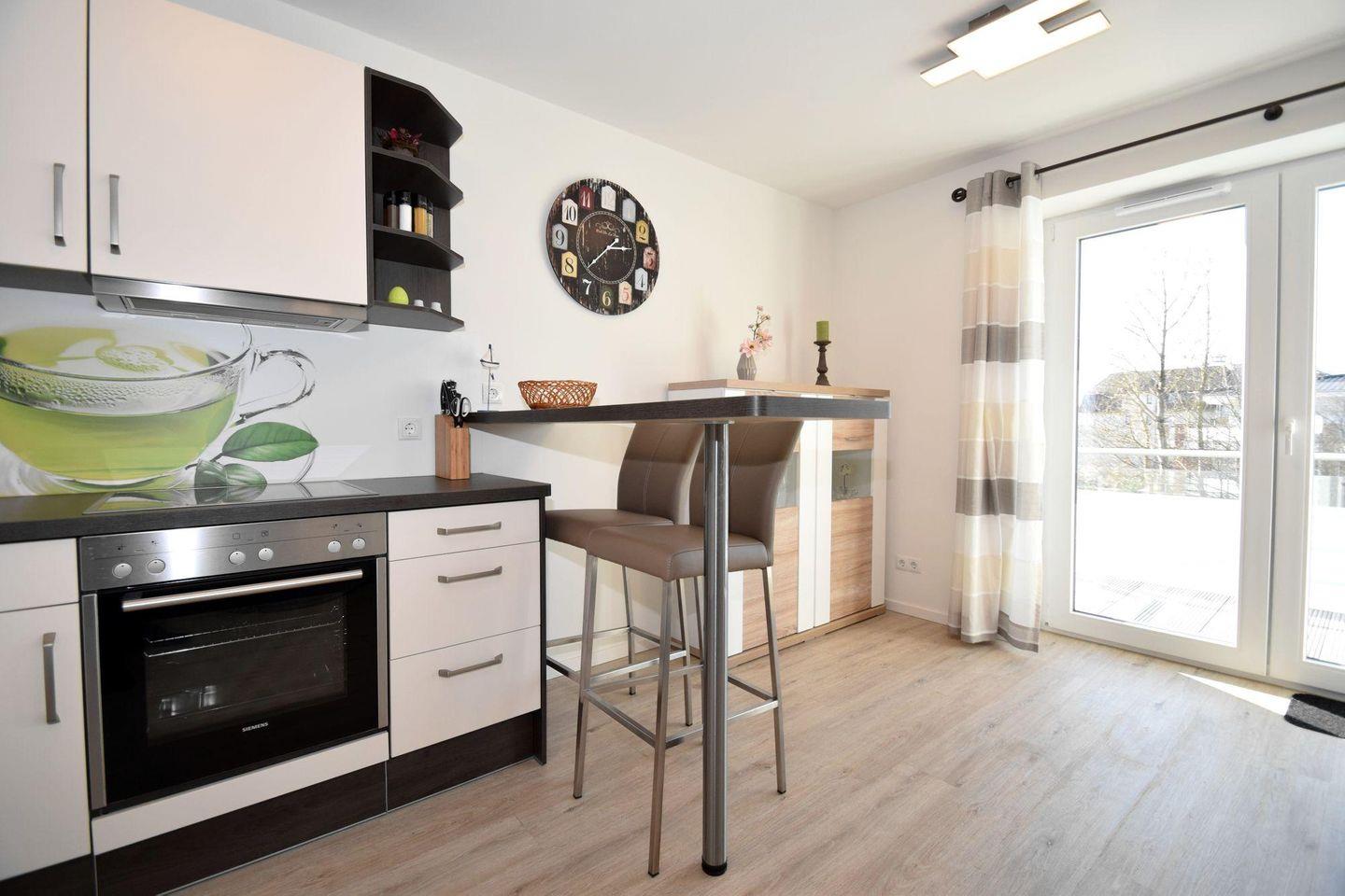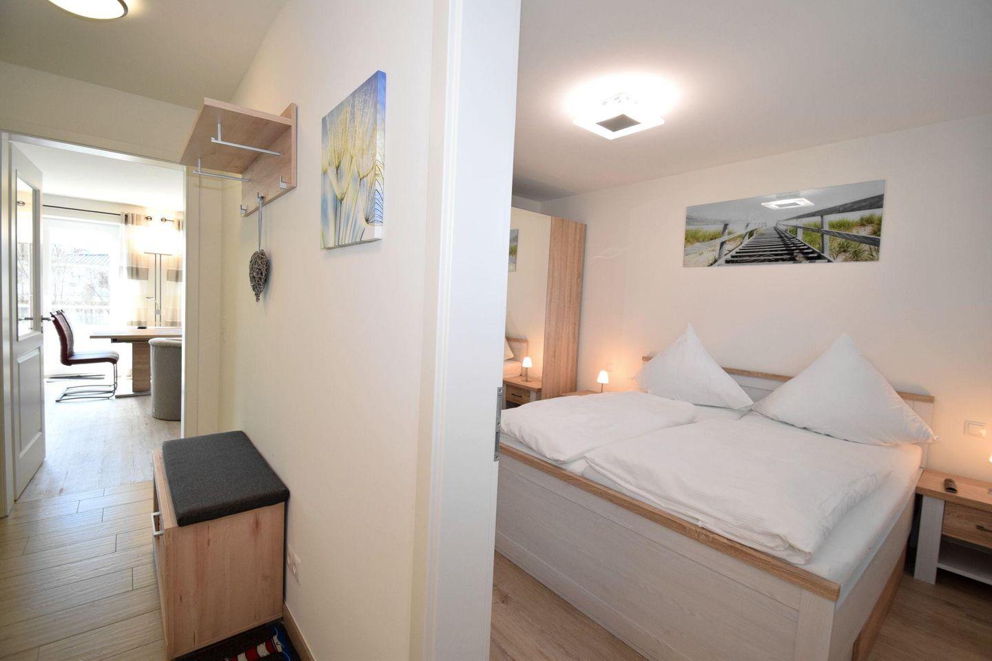 Die Ferienwohnung 2.6 ist eine schöne 2-Raum-Wohnung mit Balkon. Die Küchenzeile und der Essbereich sind direkt im Wohnbereich integriert. Das Bad verfügt über eine ebenerdige Dusche, WC, Handtuchtrockner und Haar-Föhn. Vom Wohnbereich gelangen Sie direkt auf den Balkon.