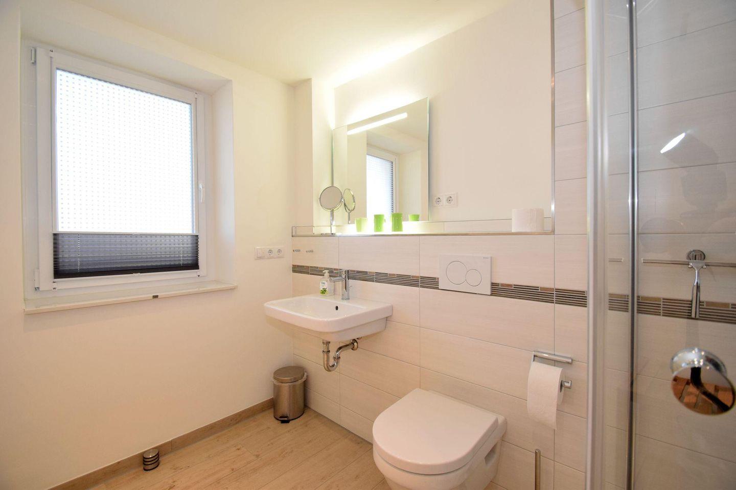 Sanitär: Duschbad mit ebenerdiger Dusche, Haar-Föhn, Kosmetikspiegel