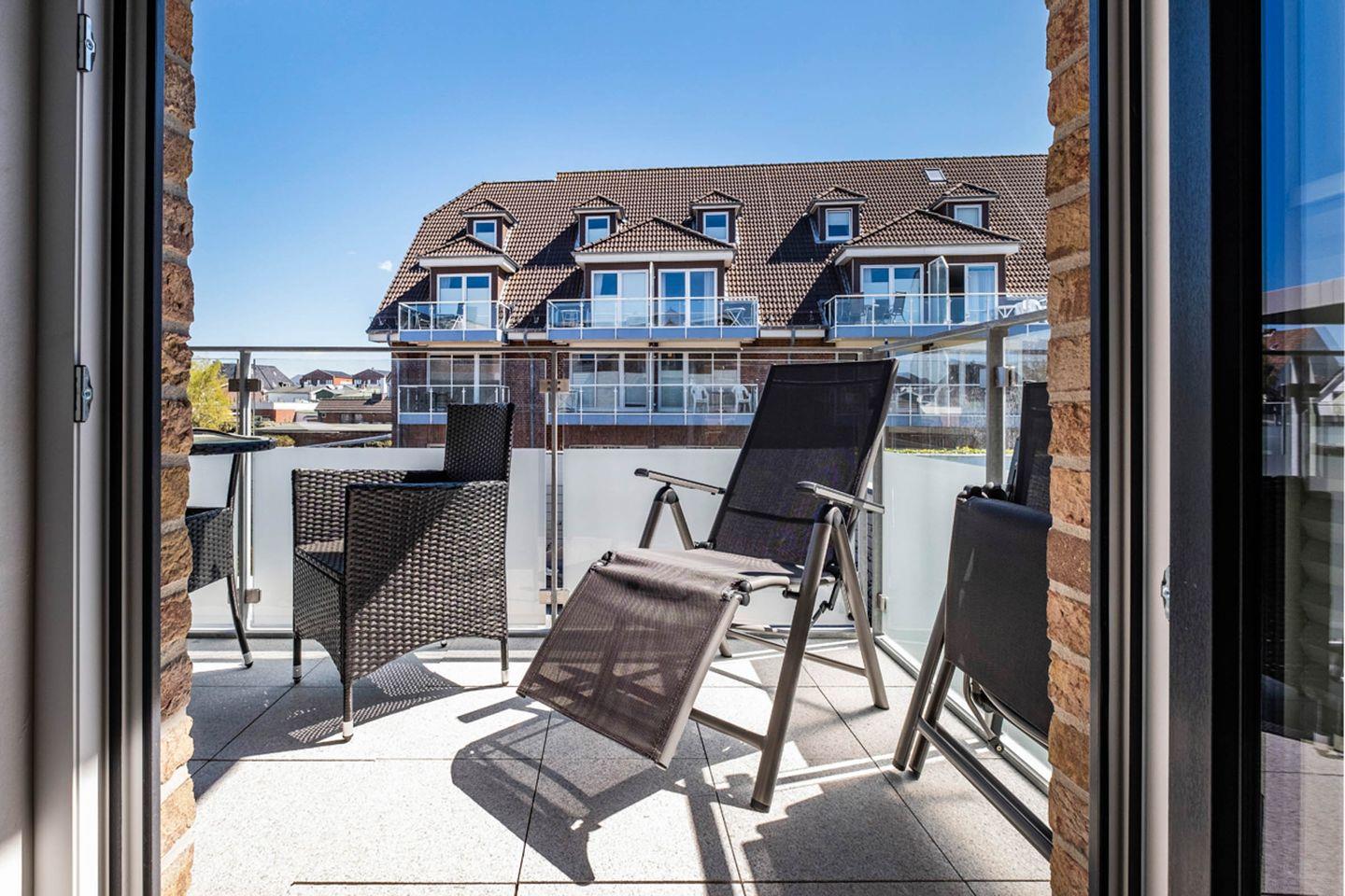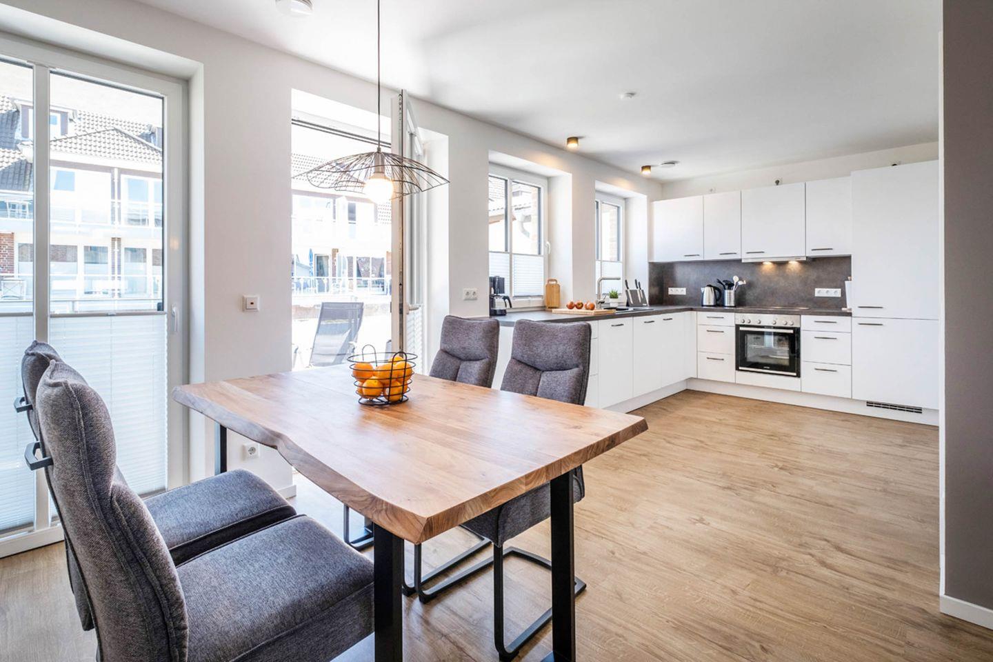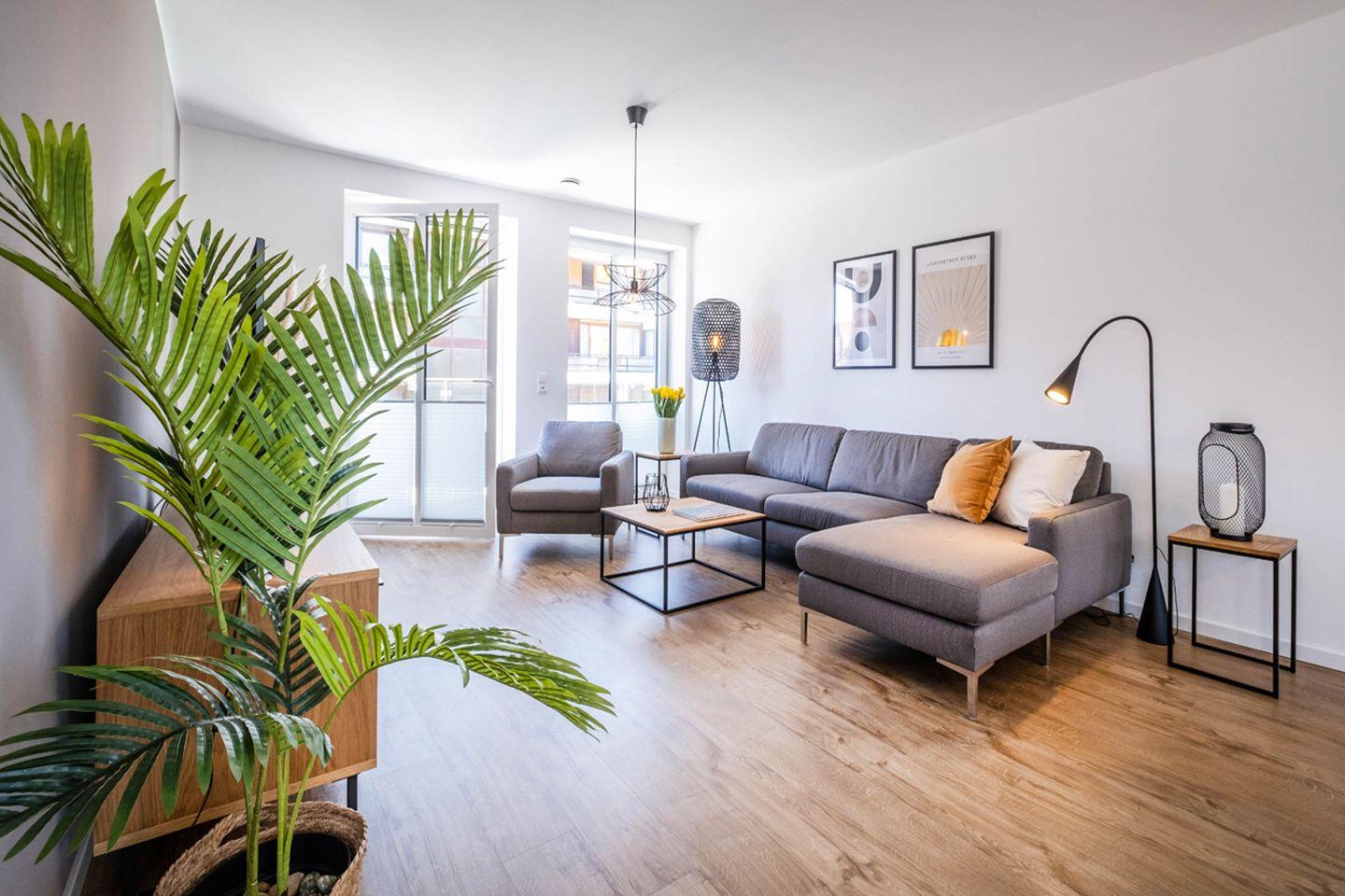 Das Apartment bietet mit 2 Schlafzimmern Platz für 4 Personen. Des Weiteren verfügt das Apartment über einen Wohn- und Essbereich mit einer offenen Küche. Das Tageslichtbad ist mit einer bodentiefen Dusche ausgestattet. Das Highlight des Apartments sind die beiden Balkone.