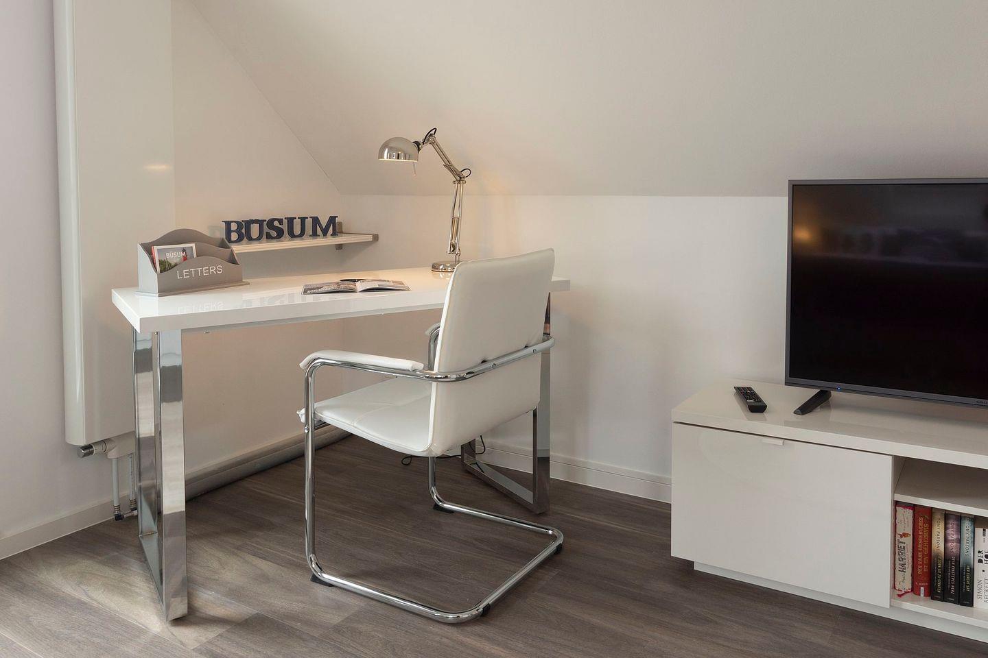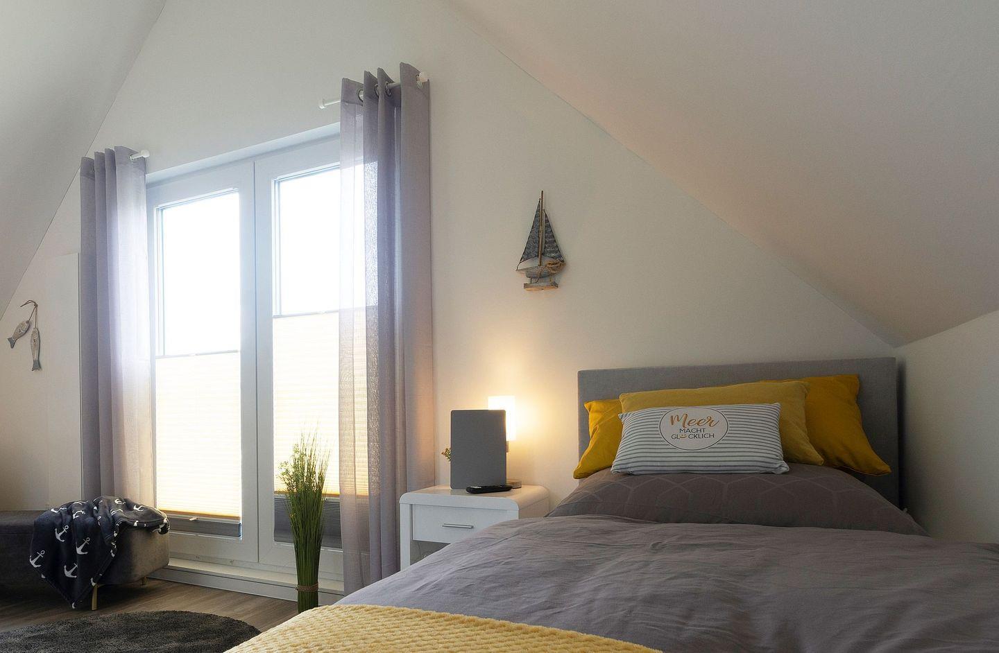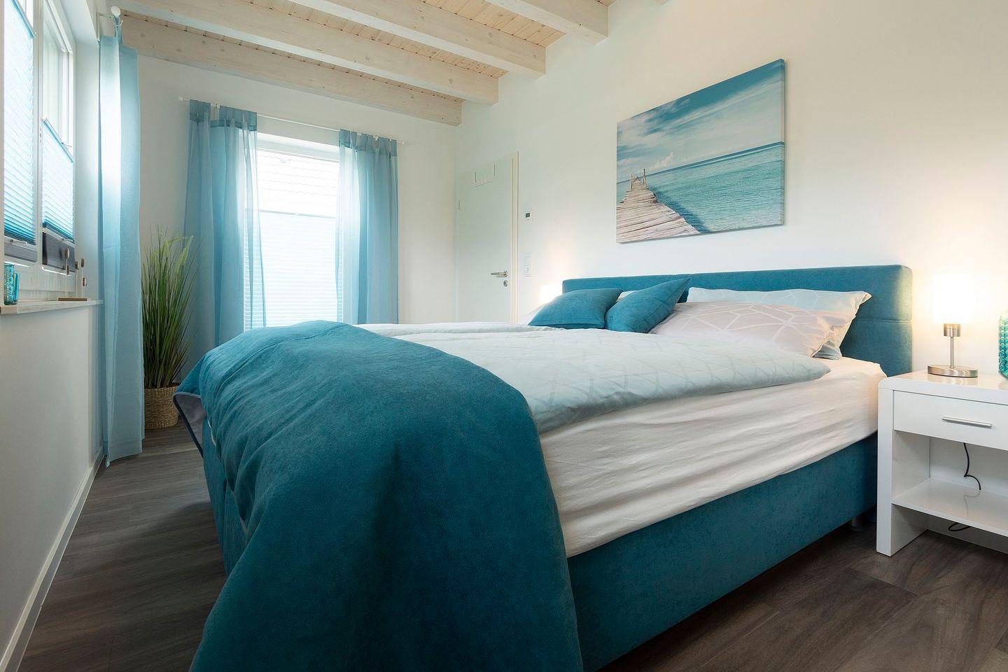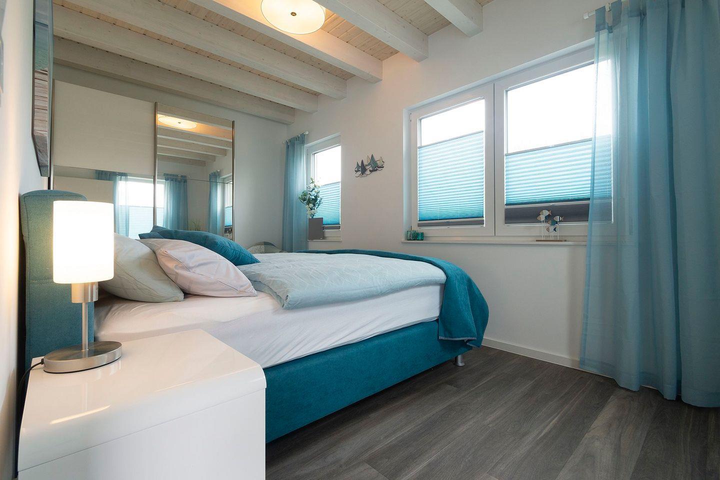 Im Obergeschoss befinden sich ein weiteres Duschbad und zwei Schlafzimmer. Die Bilder sprechen für sich. Die beiden oberen Schlafzimmer sind jeweils mit einem Fernseher ausgestattet und ein Schreibtisch, der auch zum Postkarten schreiben genutzt werden kann, ist vorhanden. Alle drei Schlafzimmer verfügen über hochwertige Boxspringbetten mit Kuschelfaktor.