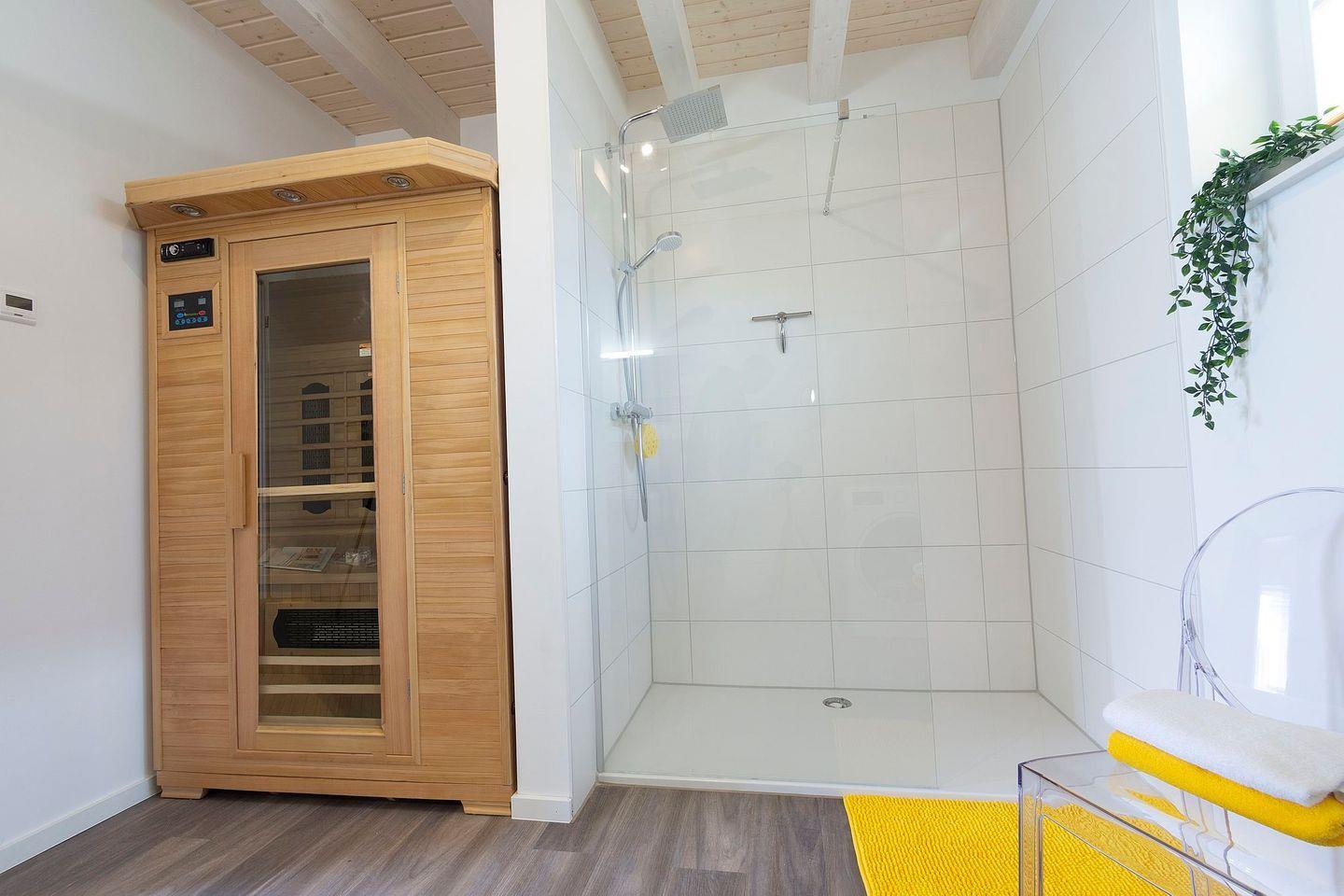 Weiterhin befindet sich im Erdgeschoss ein Duschbad mit Infrarotkabine. Nach einem ausgiebigen Spaziergang in der Natur kann man hier wieder Kräfte tanken! Auch ein weiteres Schlafzimmer ist hier vorhanden, dass an Gemütlichkeit nicht zu übertreffen ist.