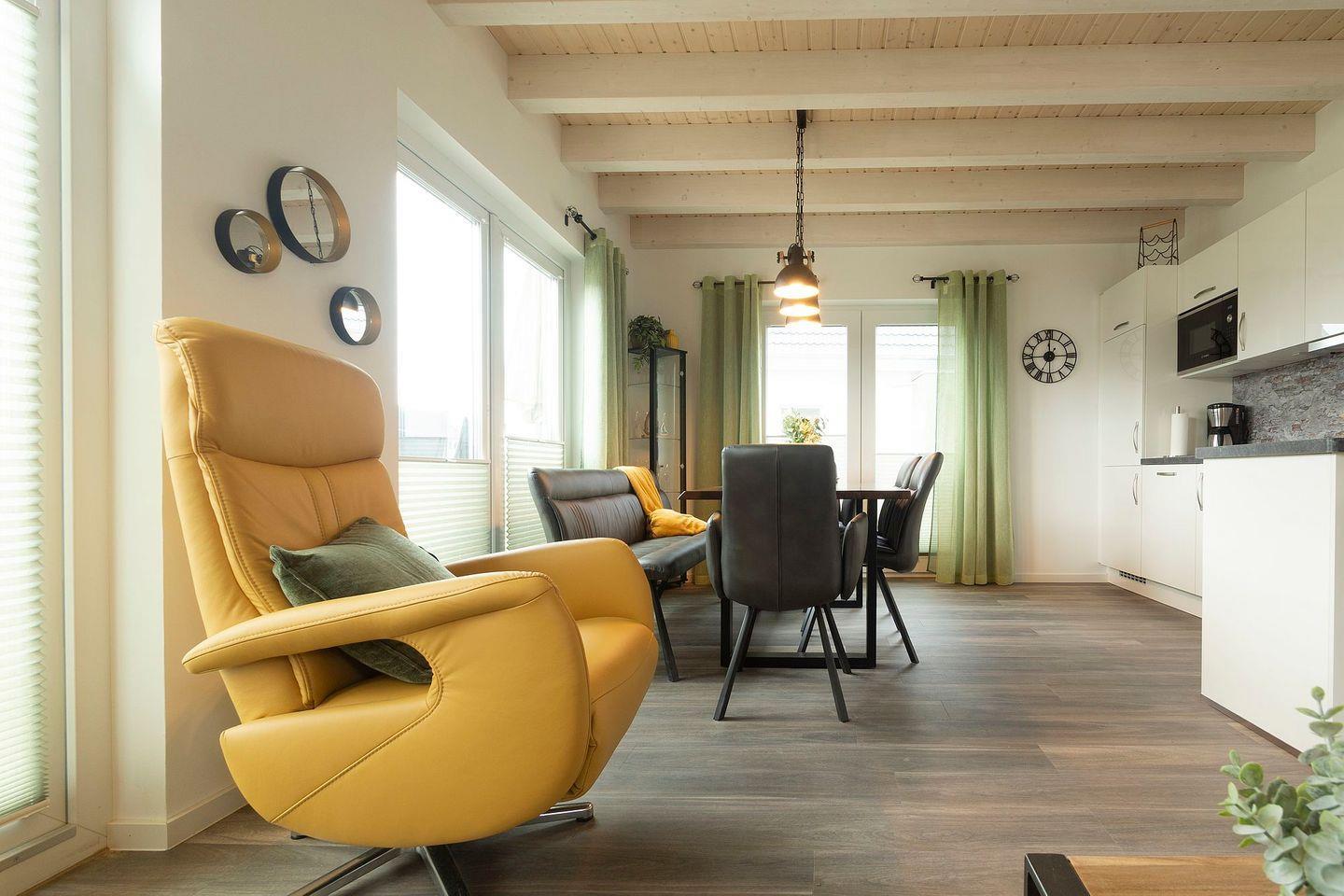 Das Wohnzimmer mit offener Küche strahlt Behaglichkeit aus, so dass sich jedermann sofort beim Betreten des Ferienhauses wie zuhause fühlt. Ein großartiger Fernseh-Sessel und eine gemütliche Couch laden zur Erholung ein. Ein großer Flatscreen-Fernseher sorgt für die Unterhaltung!