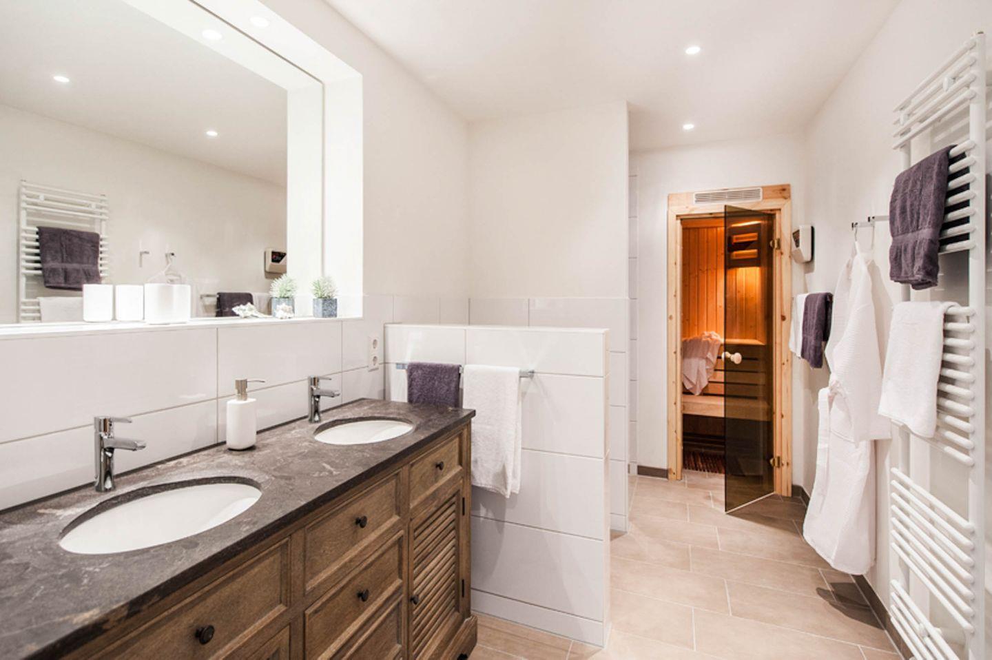 Aufgeteilt ist das Apartment in einen großzügigen Wohn- und Essbereich mit offener Küche, zwei Schlafzimmer und zwei großzügige Bäder. Ein Highlight des Apartments ist die Sauna im eigenen Badezimmer.